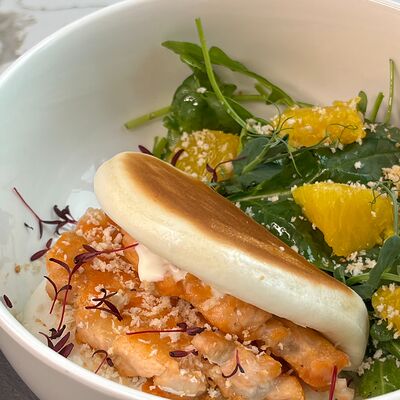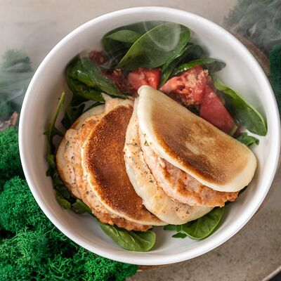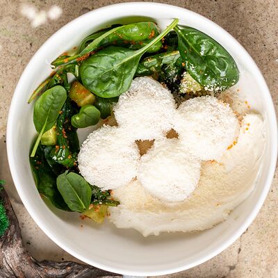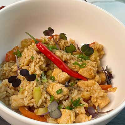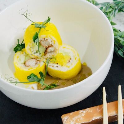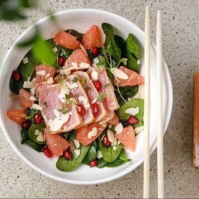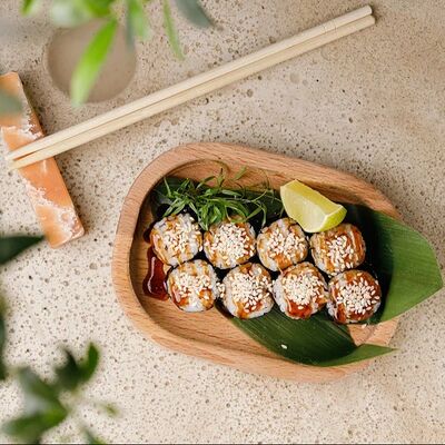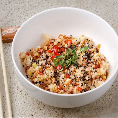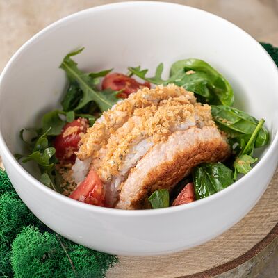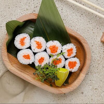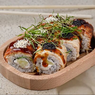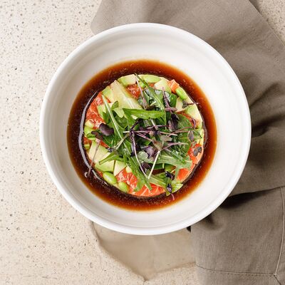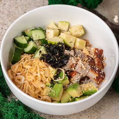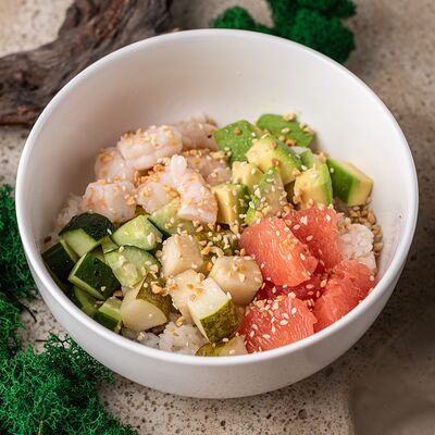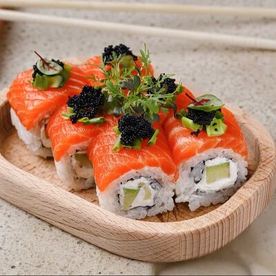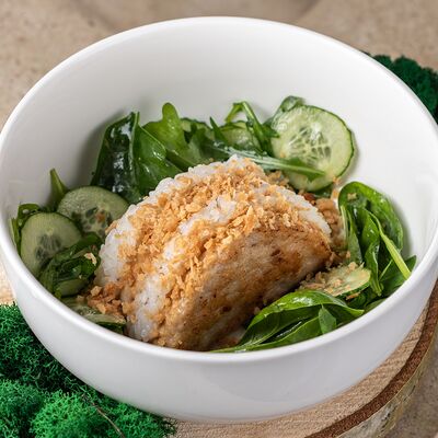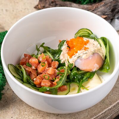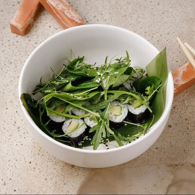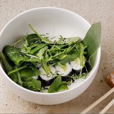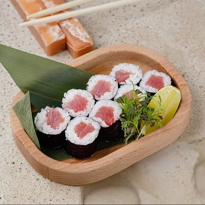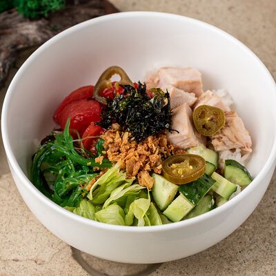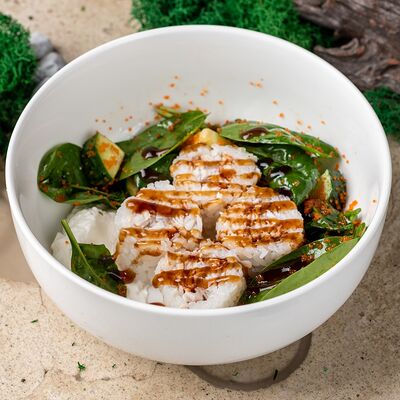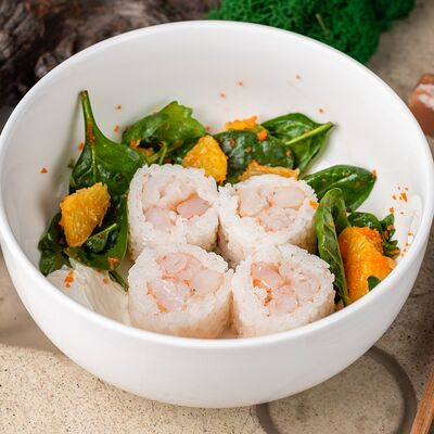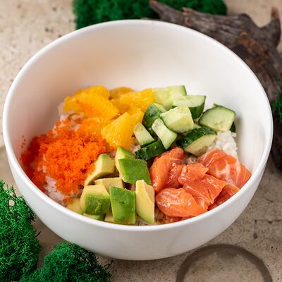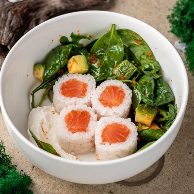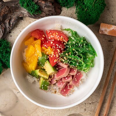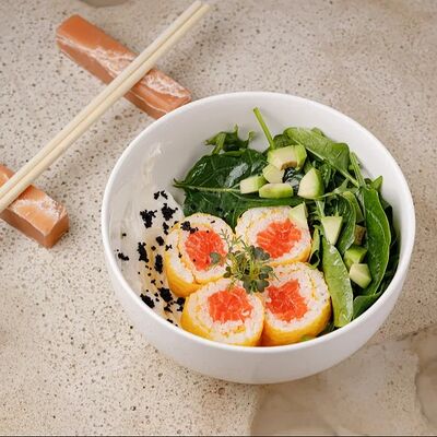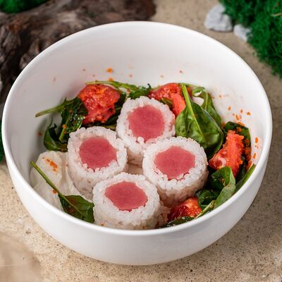 Рис, тунец, томаты, микс из зелени, соус джисо, икра масаго, крем чиз