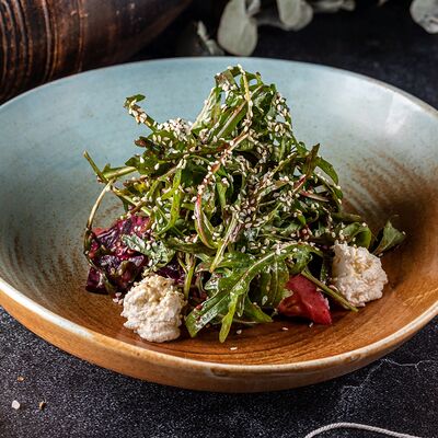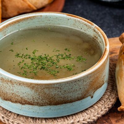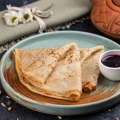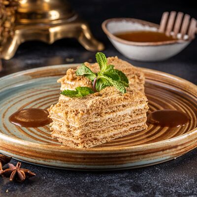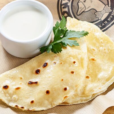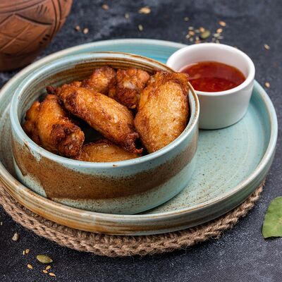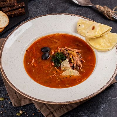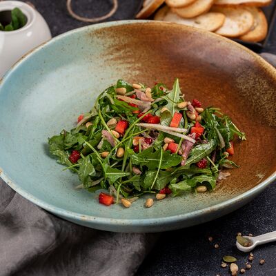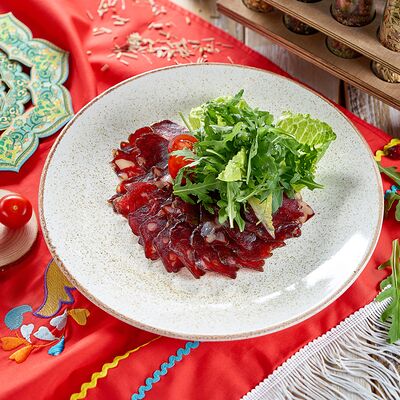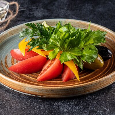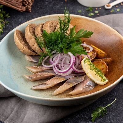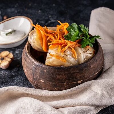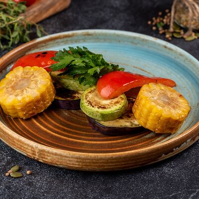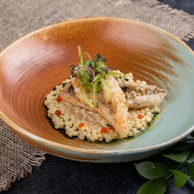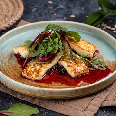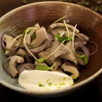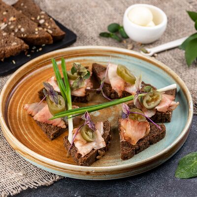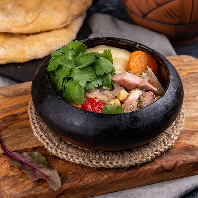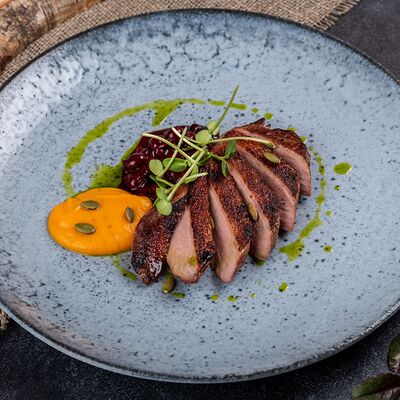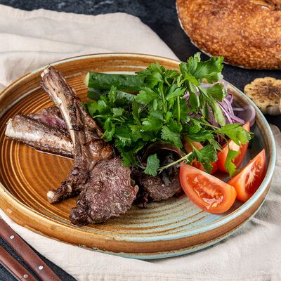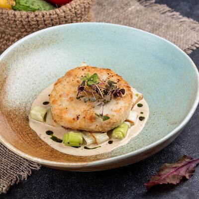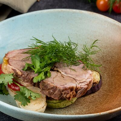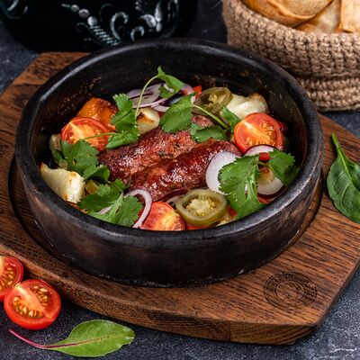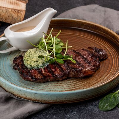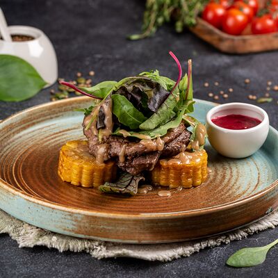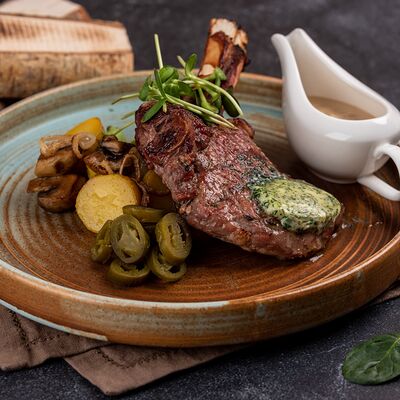 Корейка телёнка, беби-картофель, лук репчатый, шампиньоны, халапеньо, масло зеленое, соус перечный