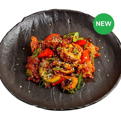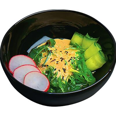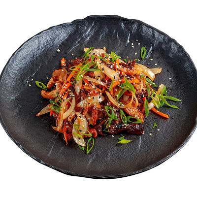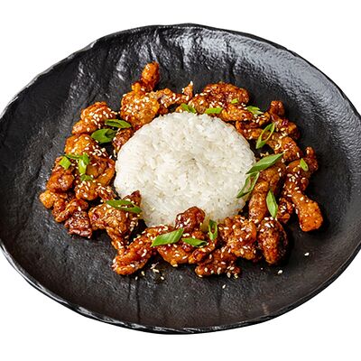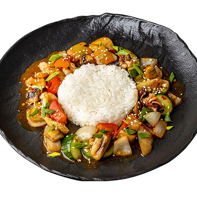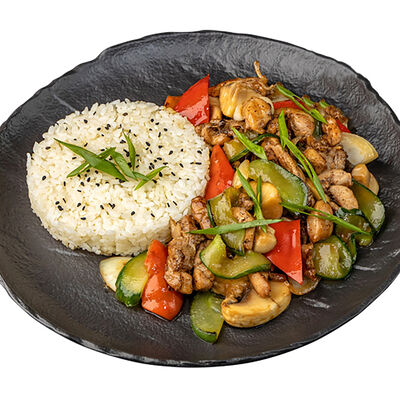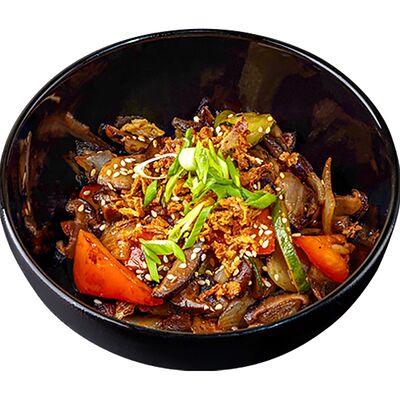 Рис, говядина обжаренная, огурец, морковь по-корейски, айсберг, томаты черри, яйцо перепелиное, ростки бобов, кунжут белый, кунжут черный, соус рао бо кай, шампиньоны