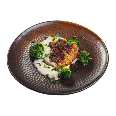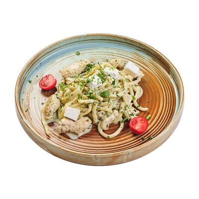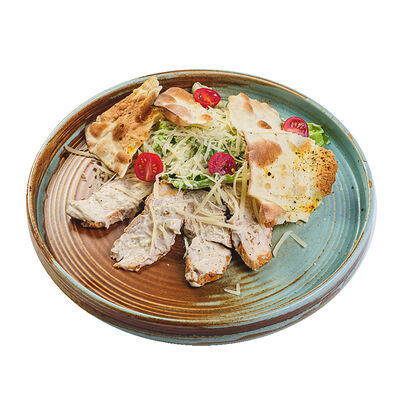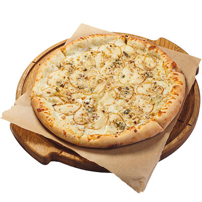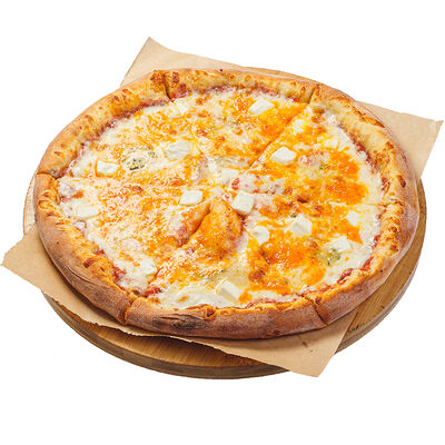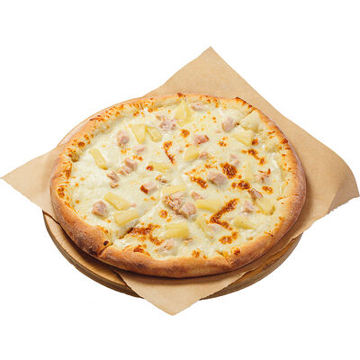 Неитальянская пицца (рецепт создал грек канадского происхождения) на основе белого соуса, ананасов, куриного филе и сыра моцарелла. Пицца 28 см