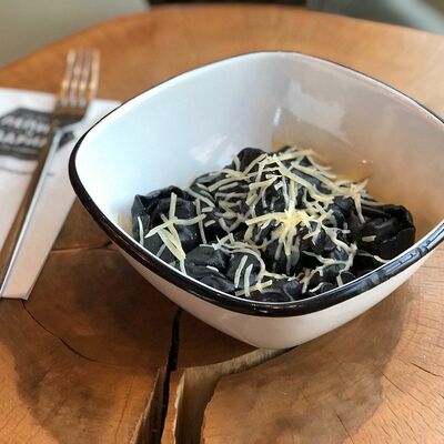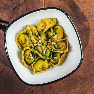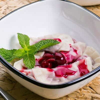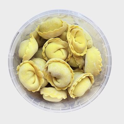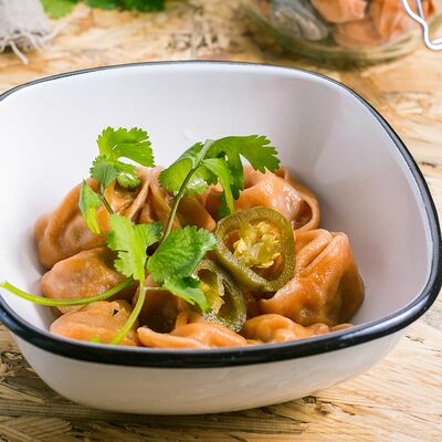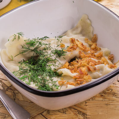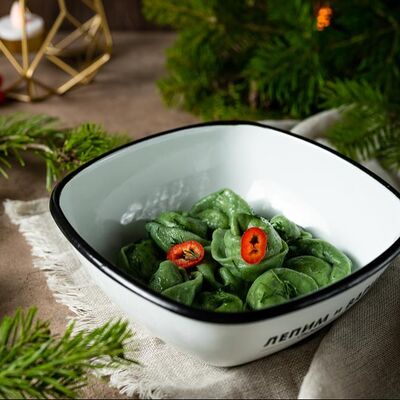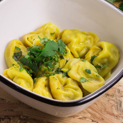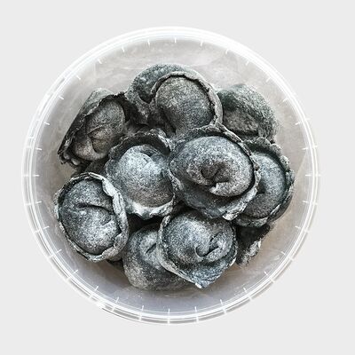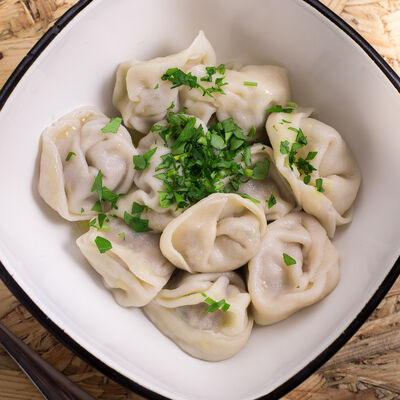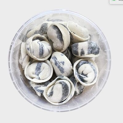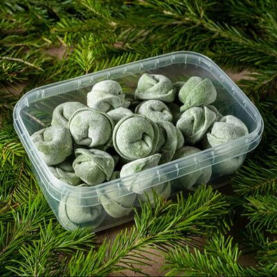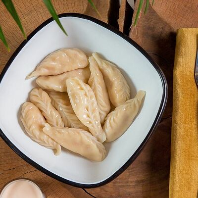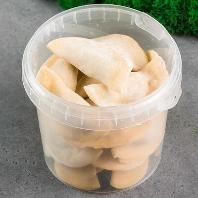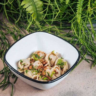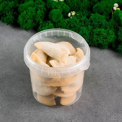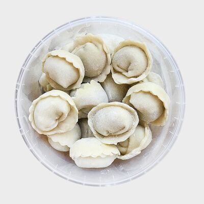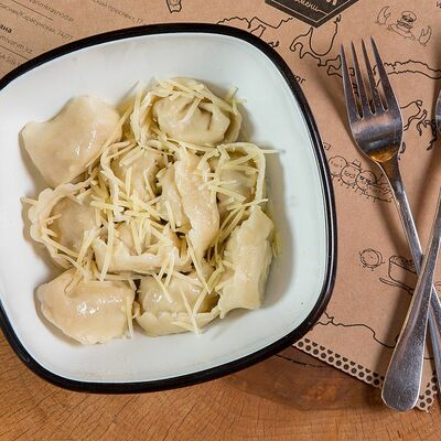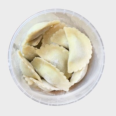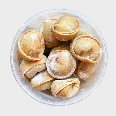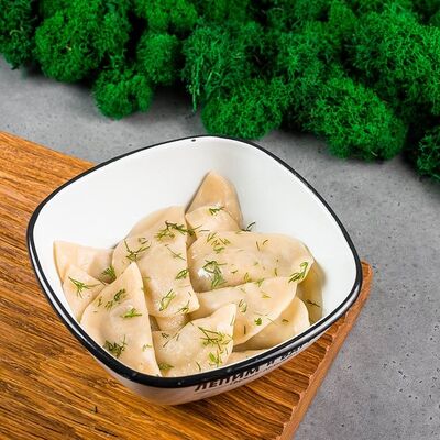 Тесто (мука пшеничная хлебопекарная высшего сорта, вода питьевая, масло подсолнечное, соль), начинка (картофель отварной, грибы белые свежемороженые, шампиньоны, лук репчатый, подсолнечное масло, грибы белые сушеные, укроп свежий, соль, перец)