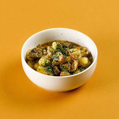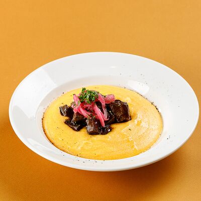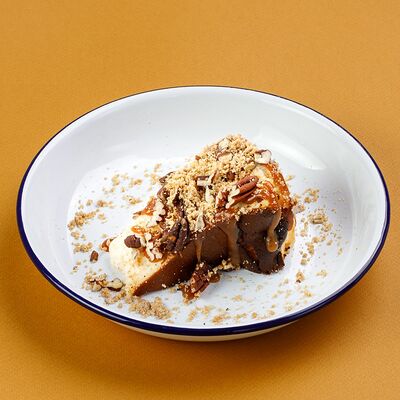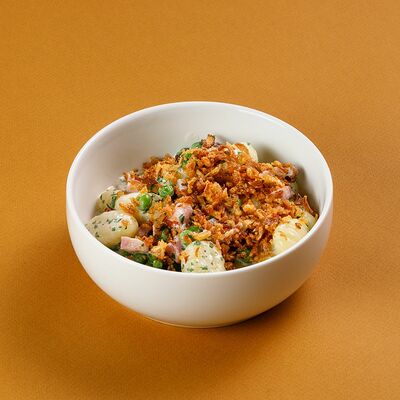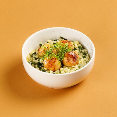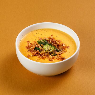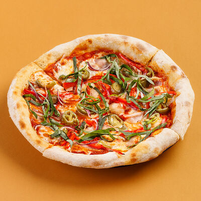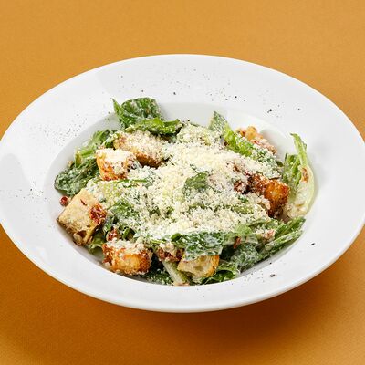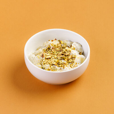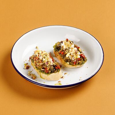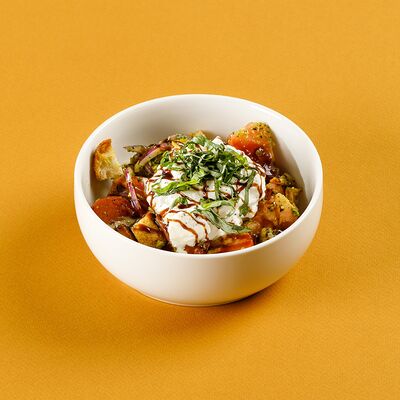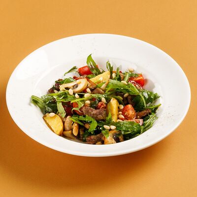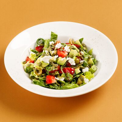 Тыква печеная, микс-салат, брынза, клюква вяленая, заправка медово-горчичная, фисташки