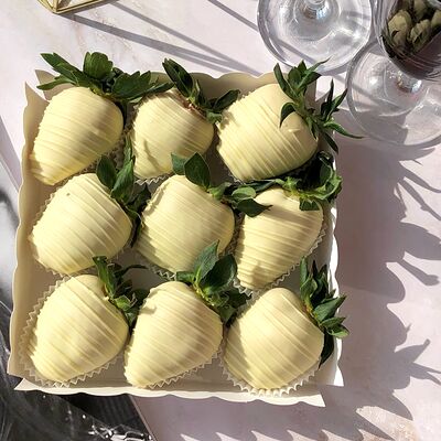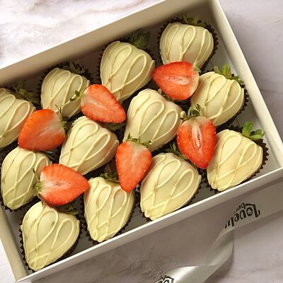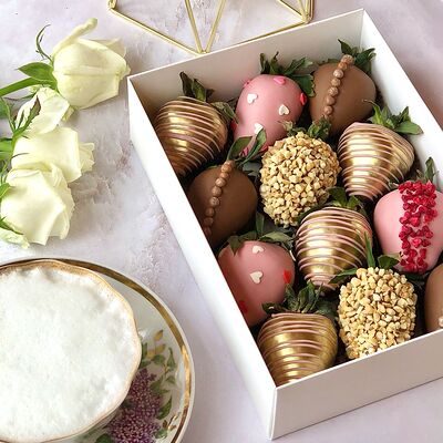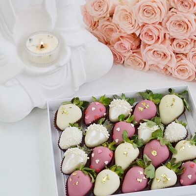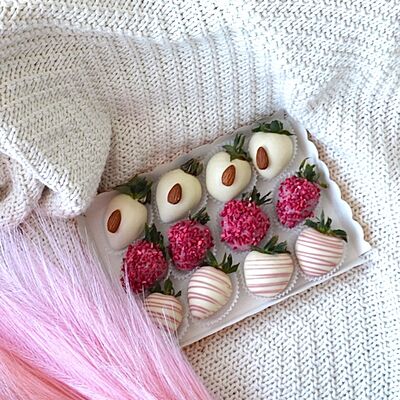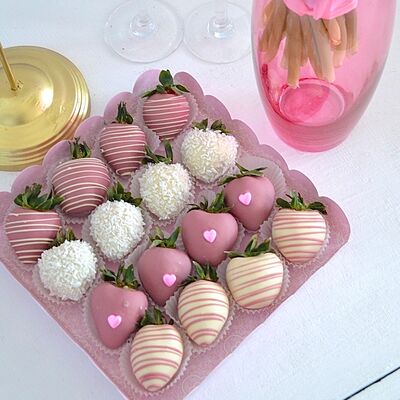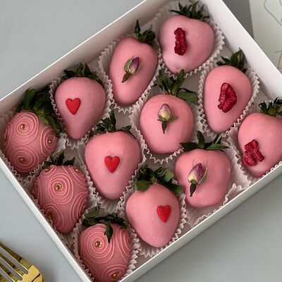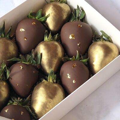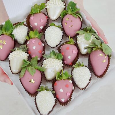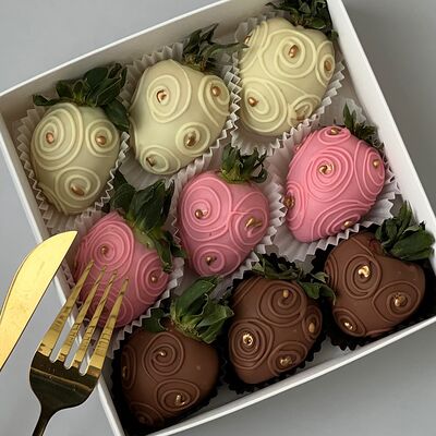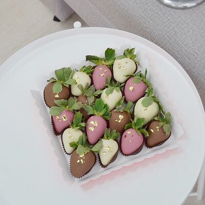 Свежая клубника в белом, молочном и розовом бельгийском шоколаде Callebaut с добавлением сусального золота (16 шт.)
