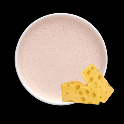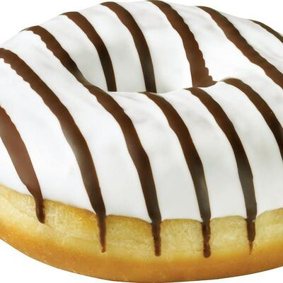 Пшеничная мука, масло растительное, вода, сахар, дрожжи, эмульгаторы (моноглицериды и диглицериды жирных кислот), лецитин (соевый), молочный сахар, сухой яичный желток, соль пищевая, соевая мука. Сладкий пончик на дрожжевом тесте с начинкой из ванильного крема. Сверху кондитерское изделие покрыто белой глазурью с полосами темной глазури