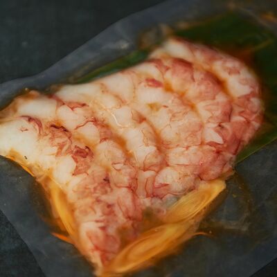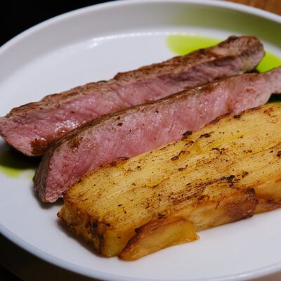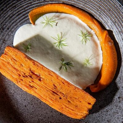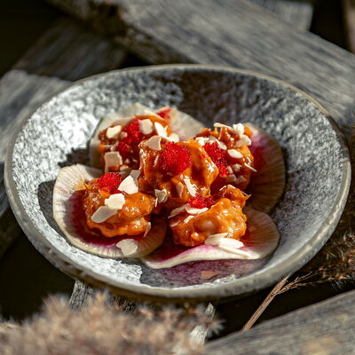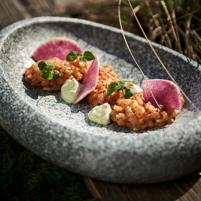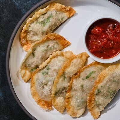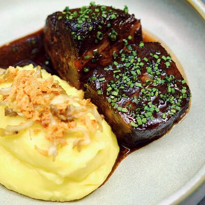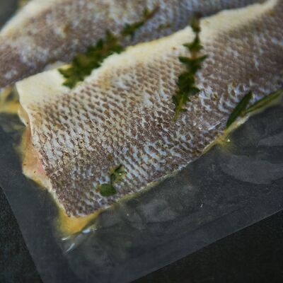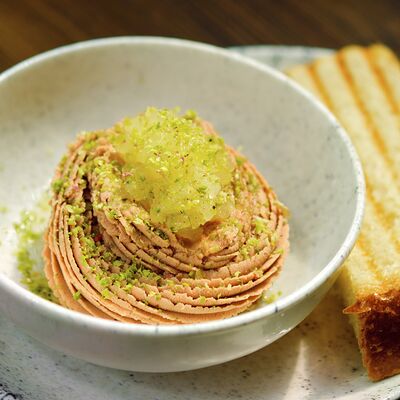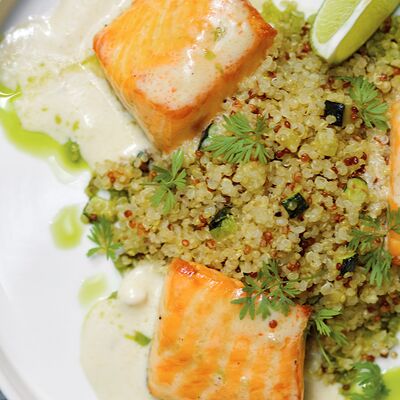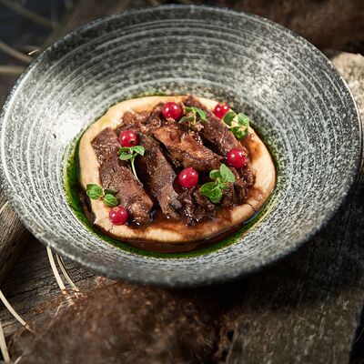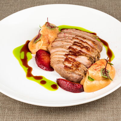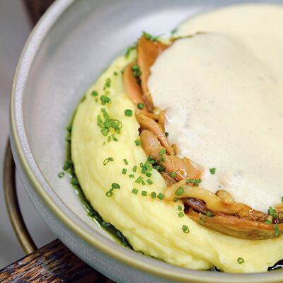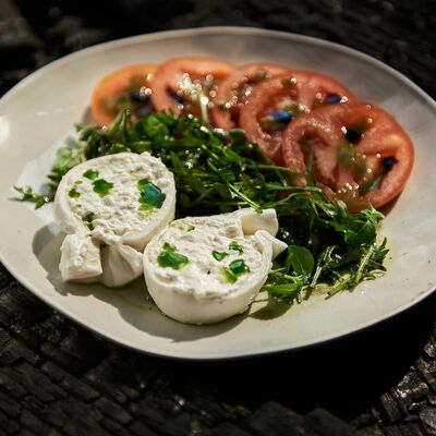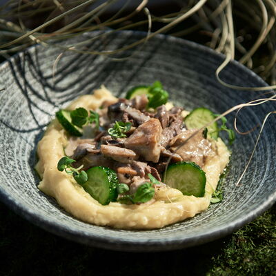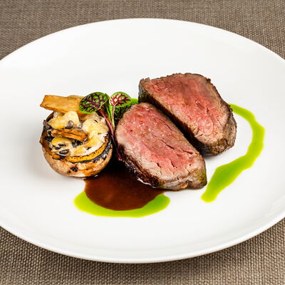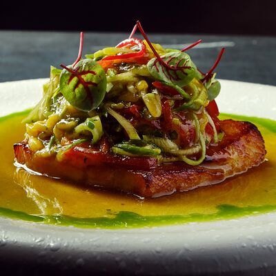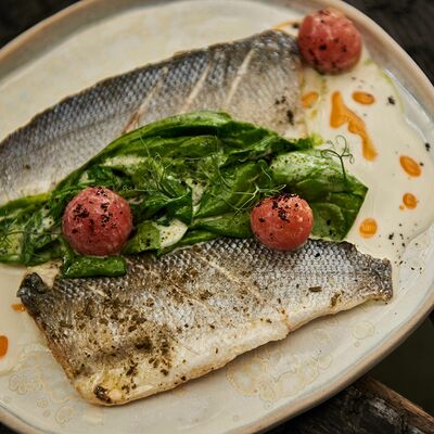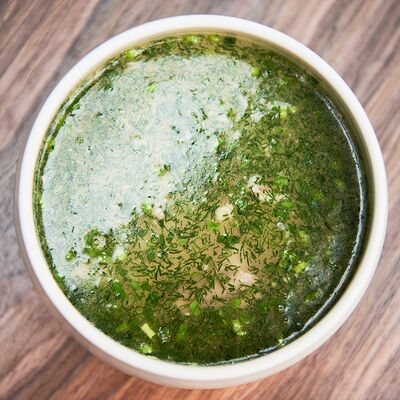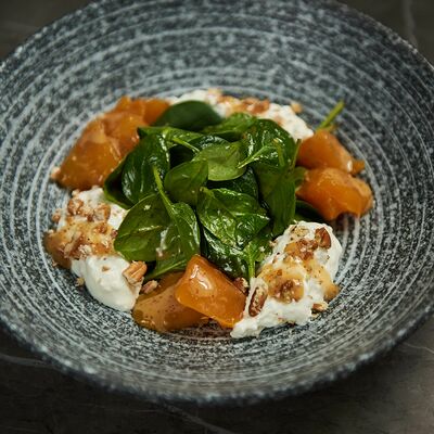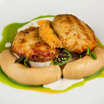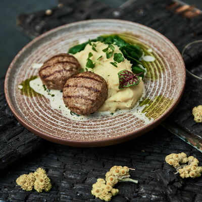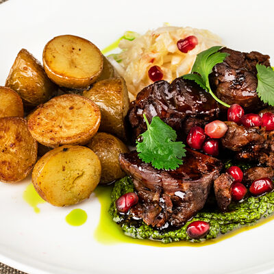 С картофельно-шпинатным пюре и томатным соусом, зеленое масло