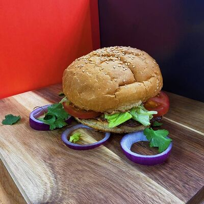 Котлета говяжья, фирменный барбекю-соус, помидор, салат айсберг, красный лук, булочка