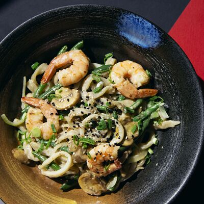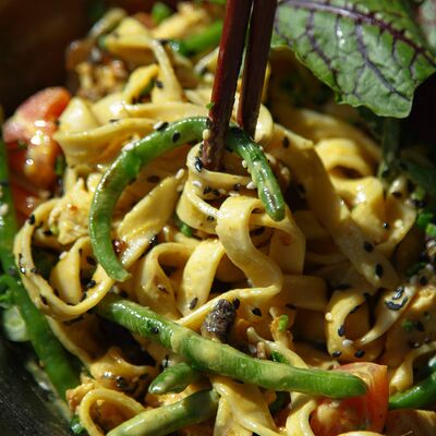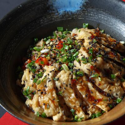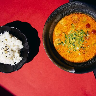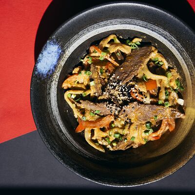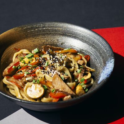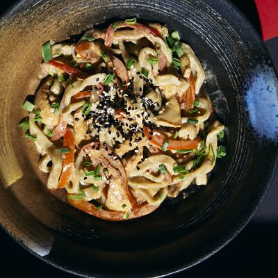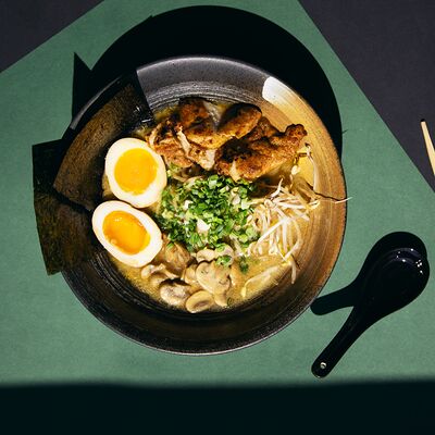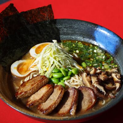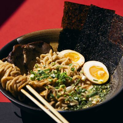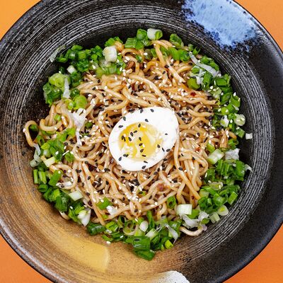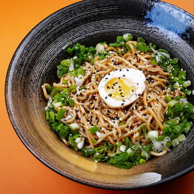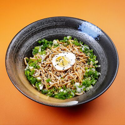 Легендарный японский рамен без бульона, Насыщенный плотный соус, пшеничная лапша, маринованное яйцо и зеленый лук, белок на выбор