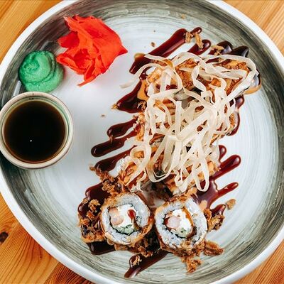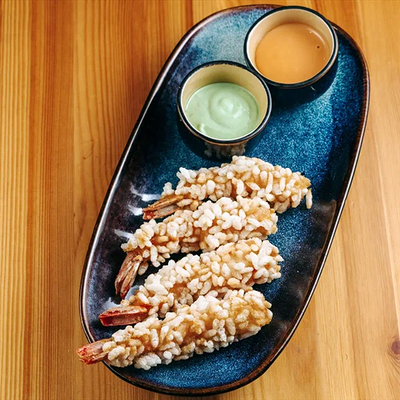Мясистые тигровые креветки покрытые корочкой воздушного риса, которые отлично дополняются азиатскими соусами