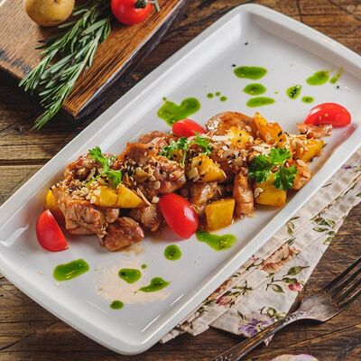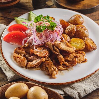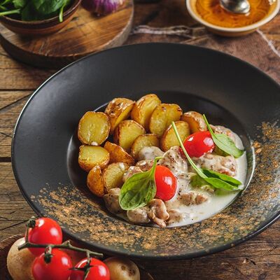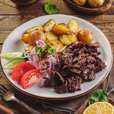 Говяжья вырезка, жареный картофель, йогуртовая заправка, томатный соус