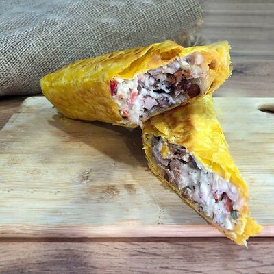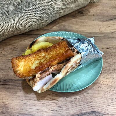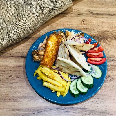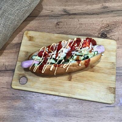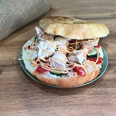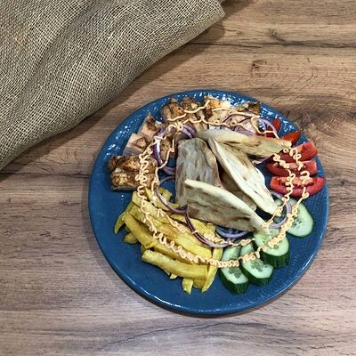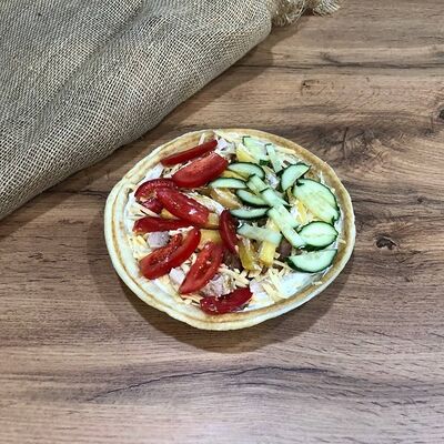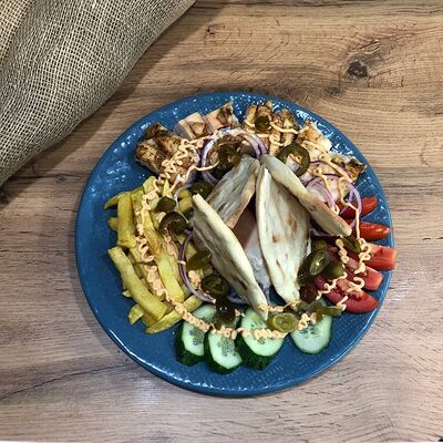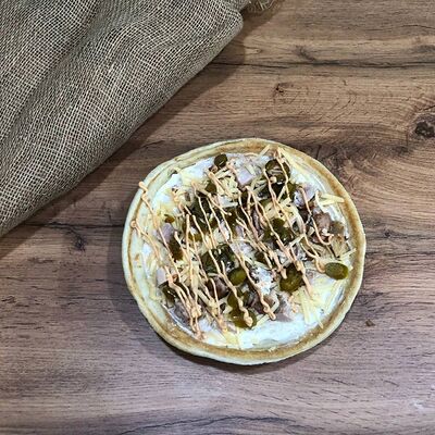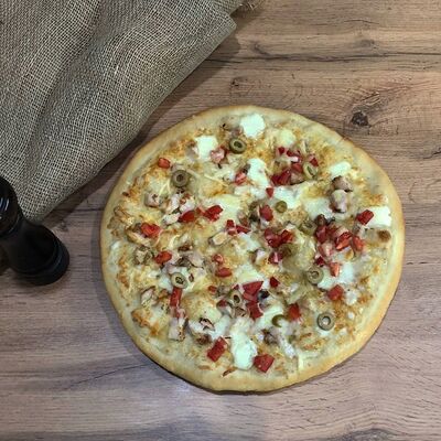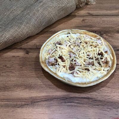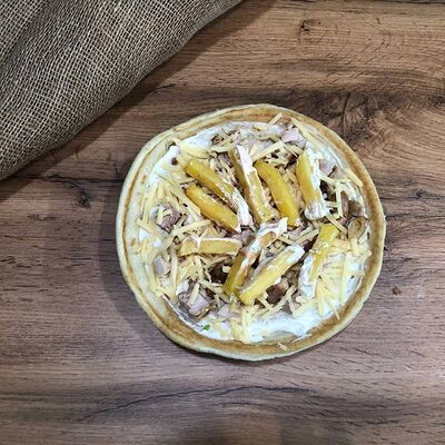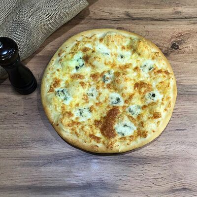 Куриное филе на углях, сыр деревенский, соус красный, соус фирменный чесночный, картошка, сыр (20 см)