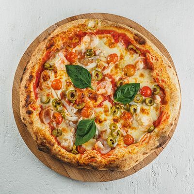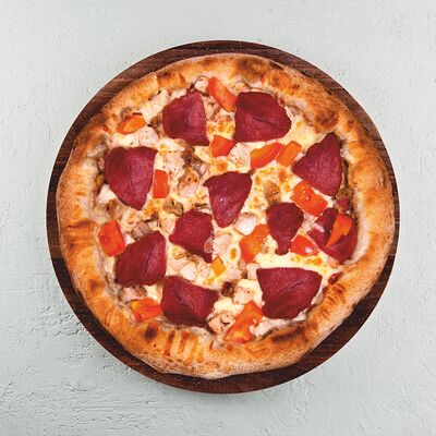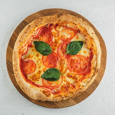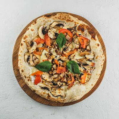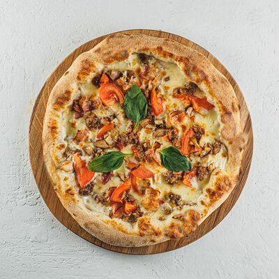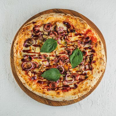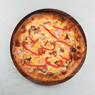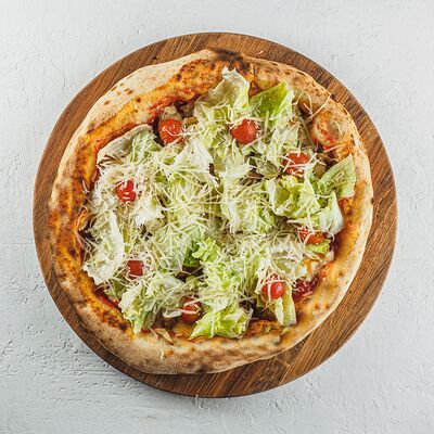 Томатный соус, сыр моцарелла, курица гриль, салат айсберг, соус цезарь, сыр пармезан, томаты чери. (30 см)
