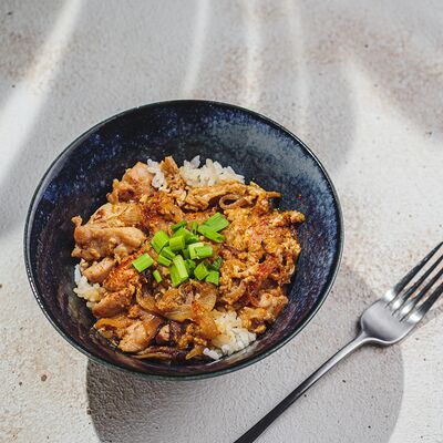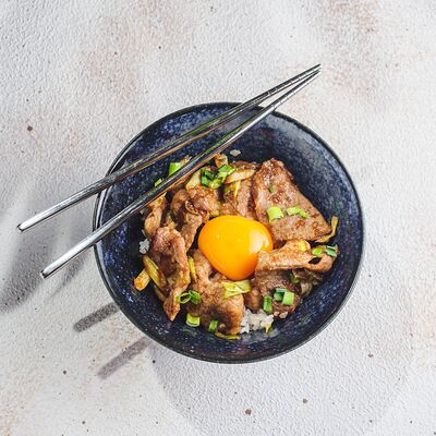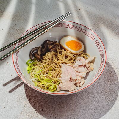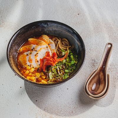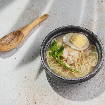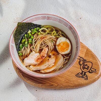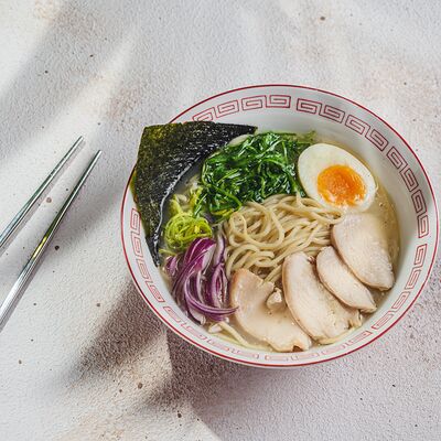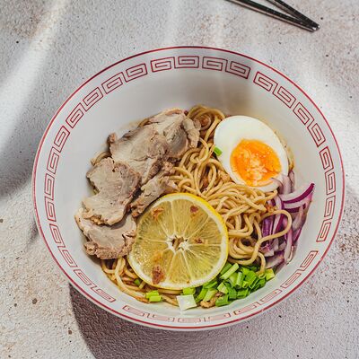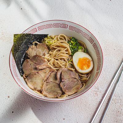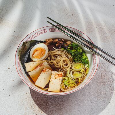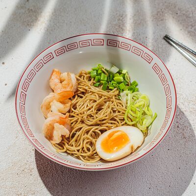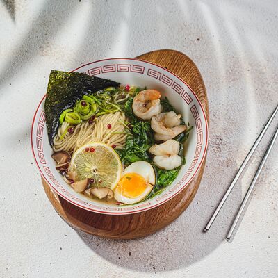 Лапша рамэн, чесночное масло, перец, лук-порей, зеленый лук, креветки, яйцо, нори