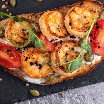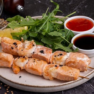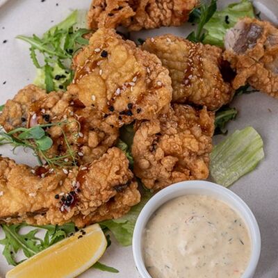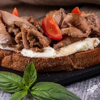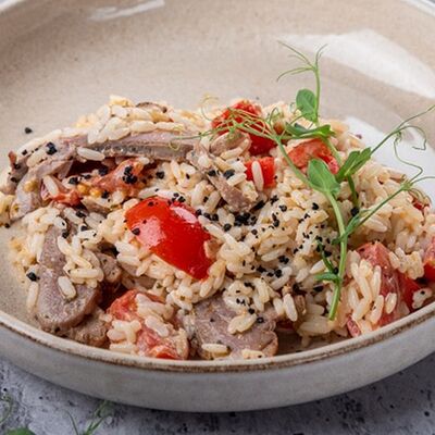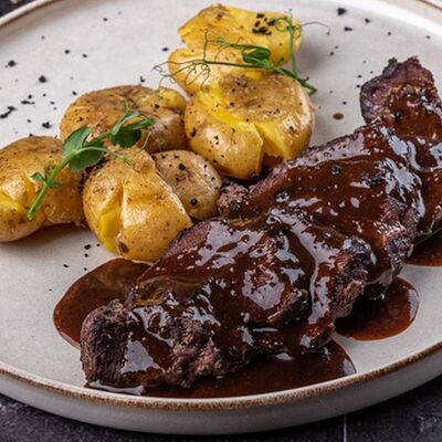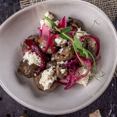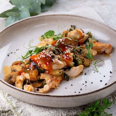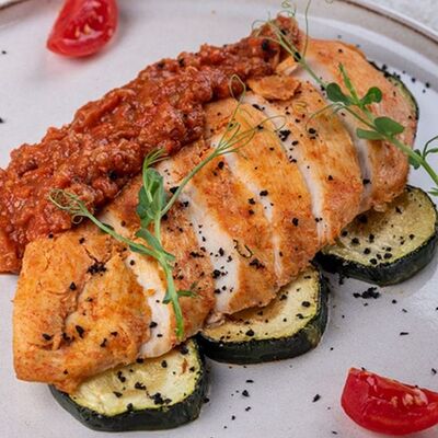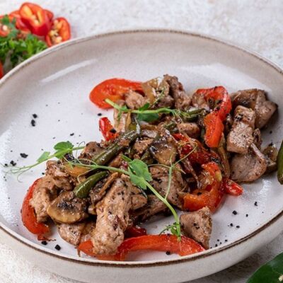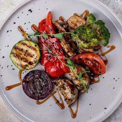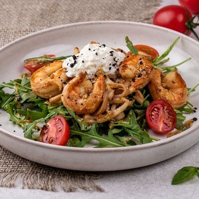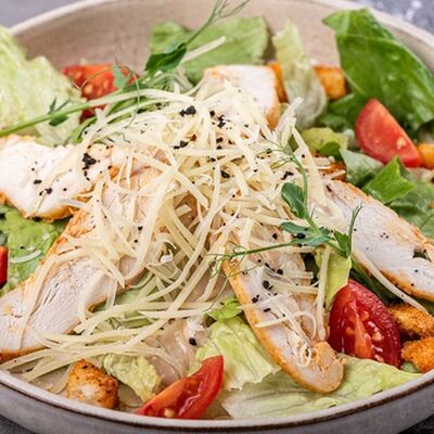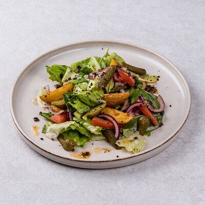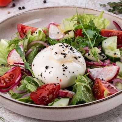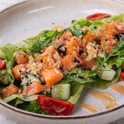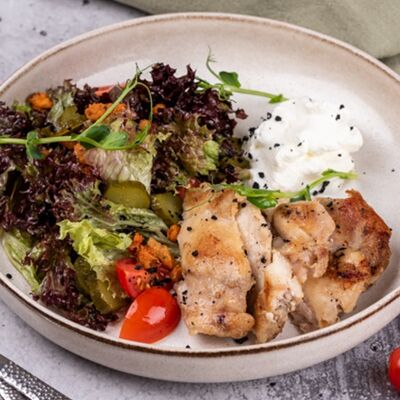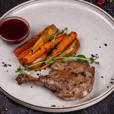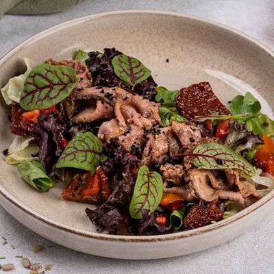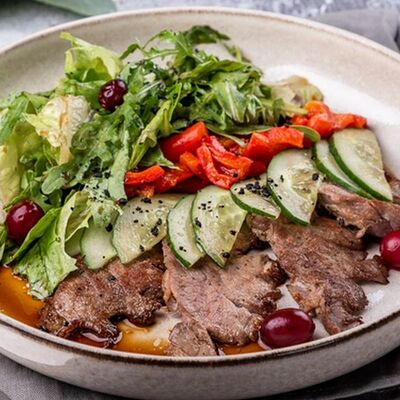 Утиная грудка, салат романо, салат руккола, перец болгарский запечённый, огурец, клюква, соевый соус, мёд, масло чесночное, земля из маслин, микрозелень