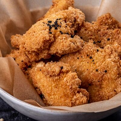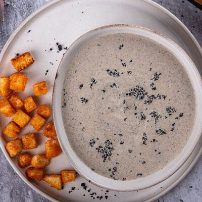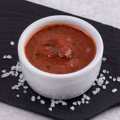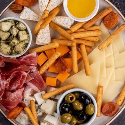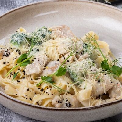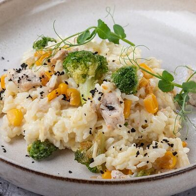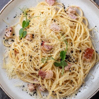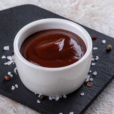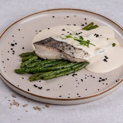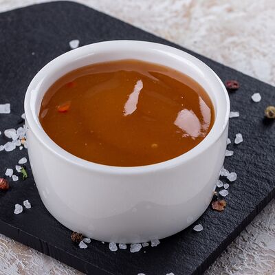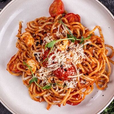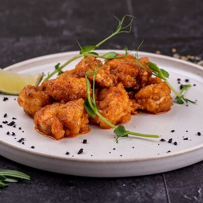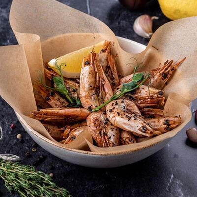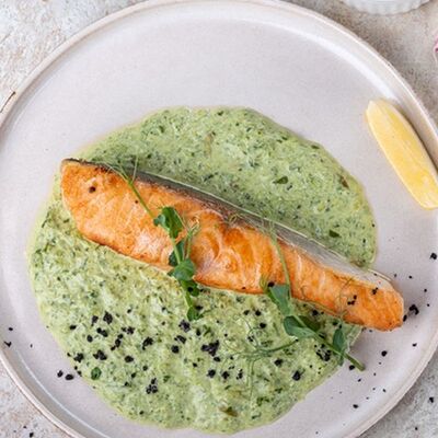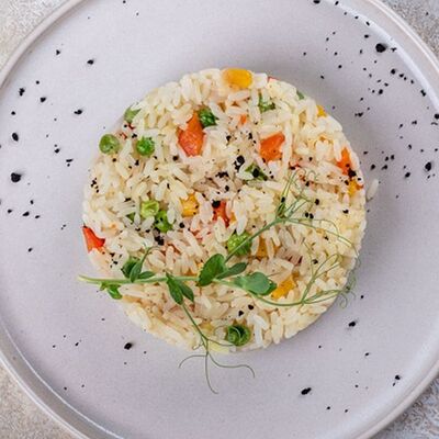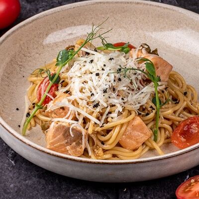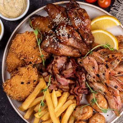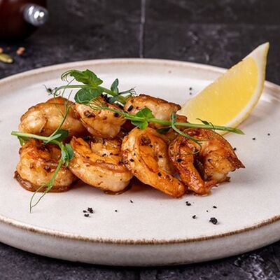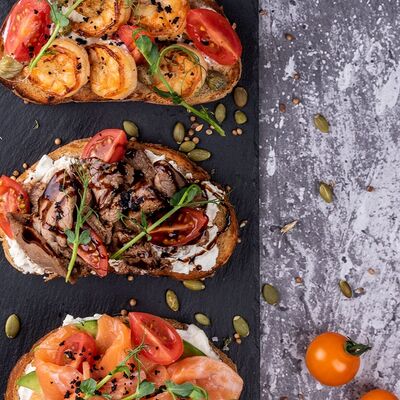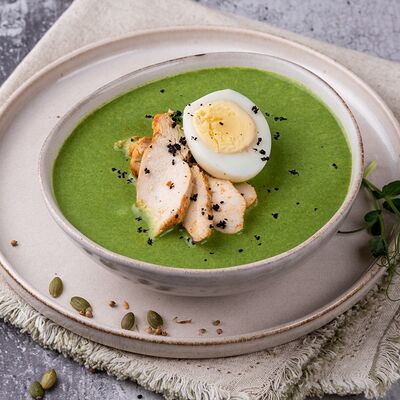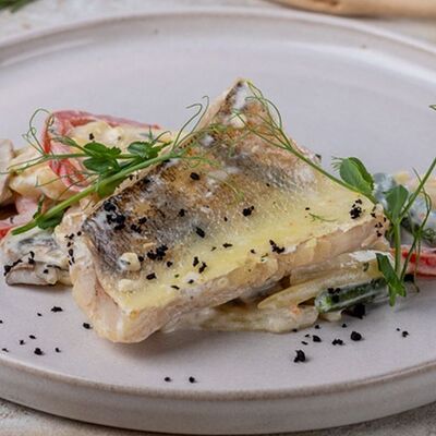 Утиная грудка, салат романо, салат руккола, перец болгарский запечённый, огурец, клюква, соевый соус, мёд, масло чесночное, земля из маслин, микрозелень