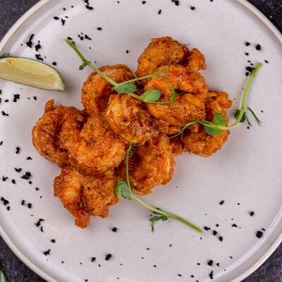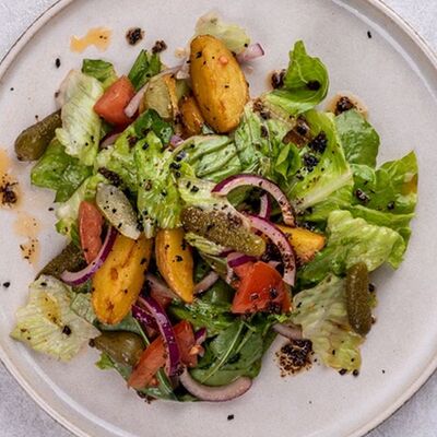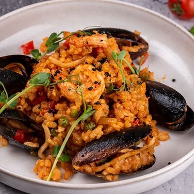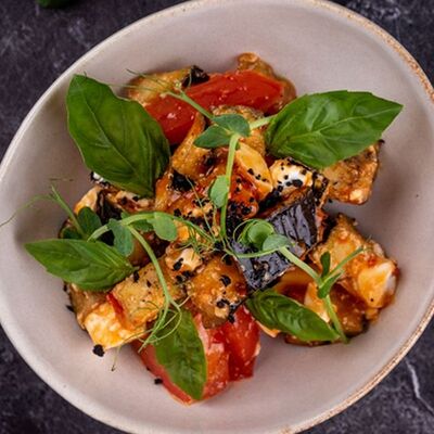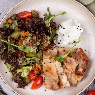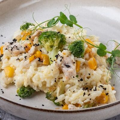 Рис, кукуруза консервированная, горошек зелёный свежемороженый, перец болгарский, земля из маслин, микрозелень