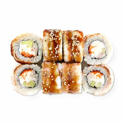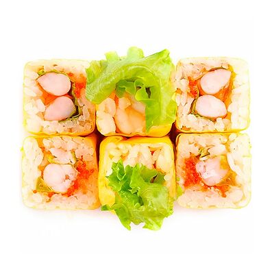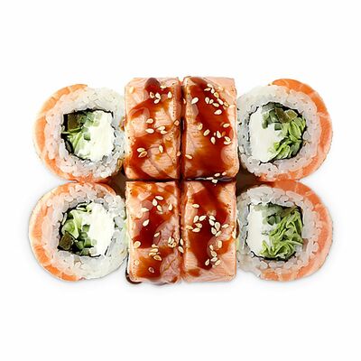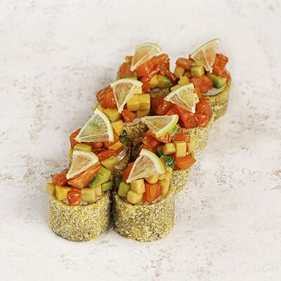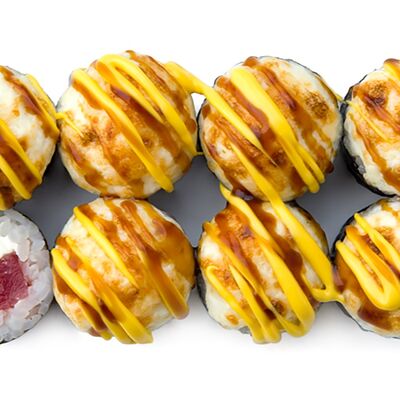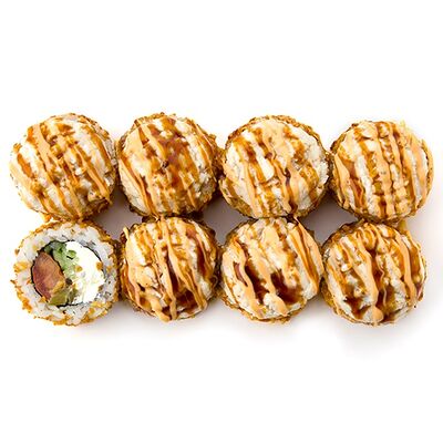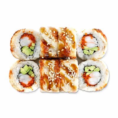 Ролл с начинкой из тигровой креветки, сливочного сыра, тамаго и авокадо под соусами спайси и унаги. На данный момент авокадо жёсткий