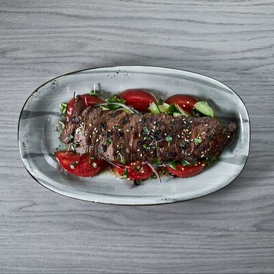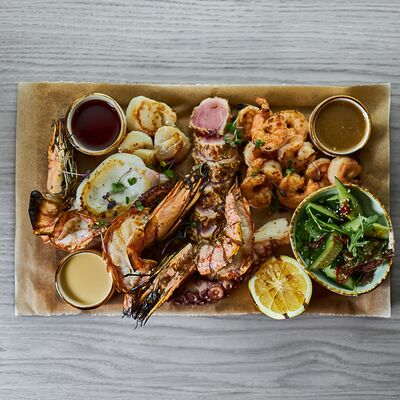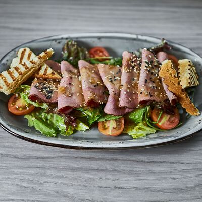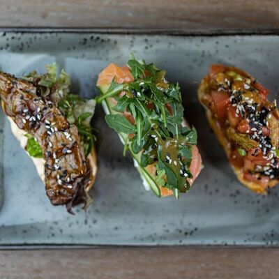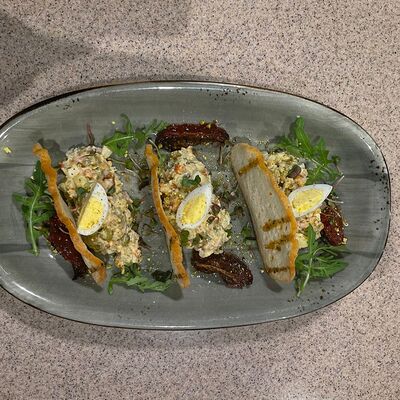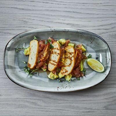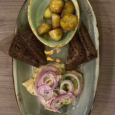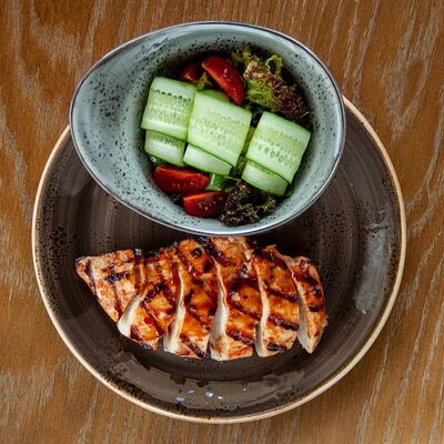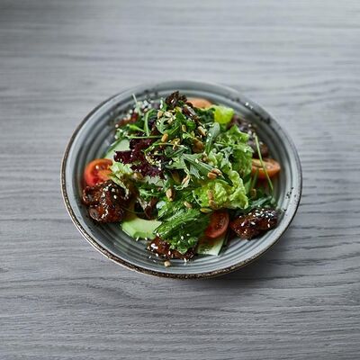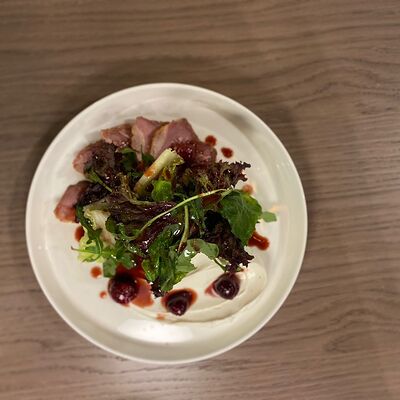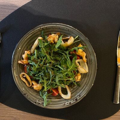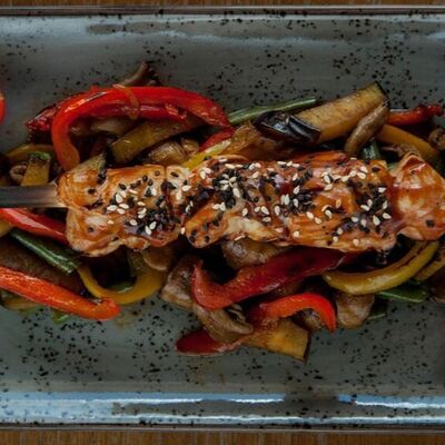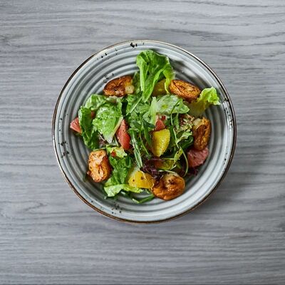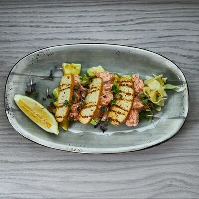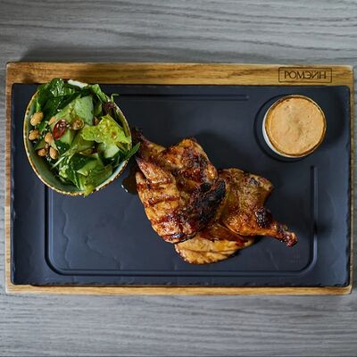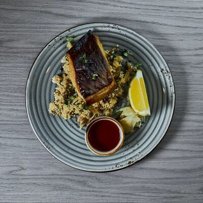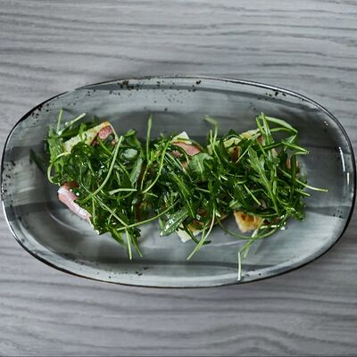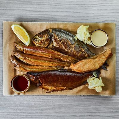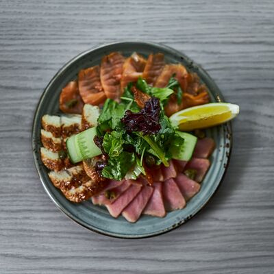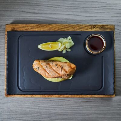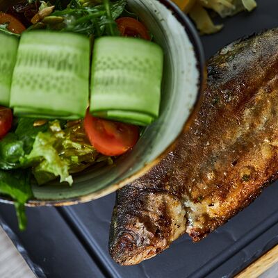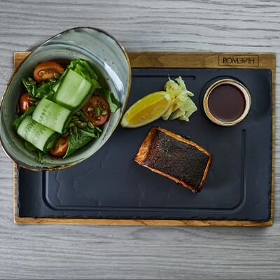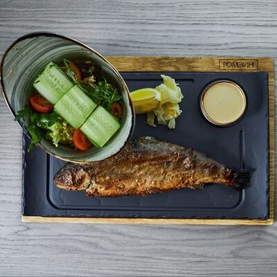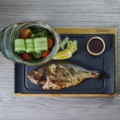 Средиземноморская дорадо, замаринованная с ароматными травами, молодым чесноком и лимоном, подается с микс салатом, долькой лимона, маринованным имбирем и маринадом Ромэйн