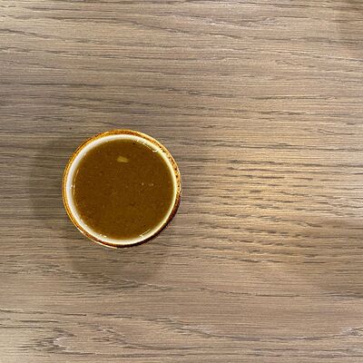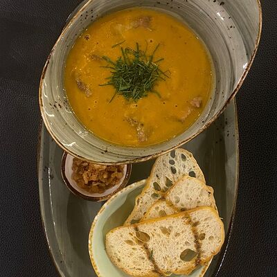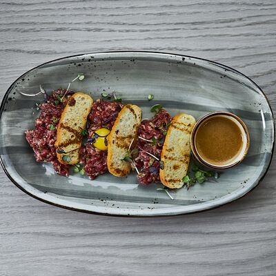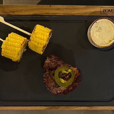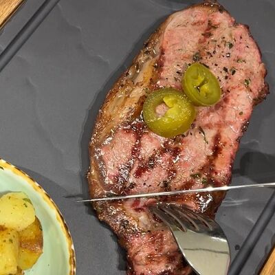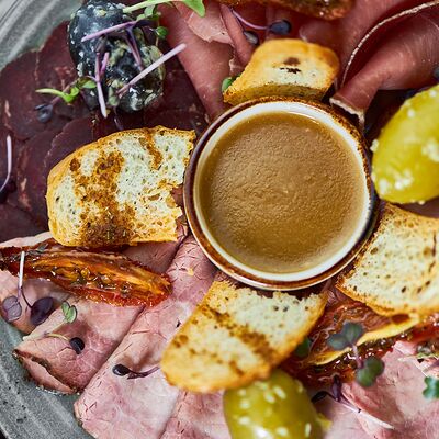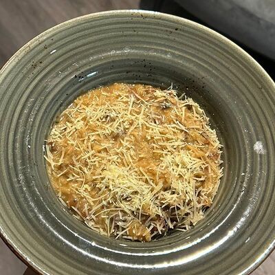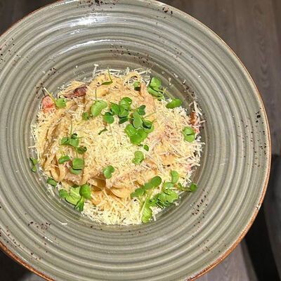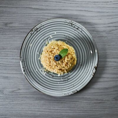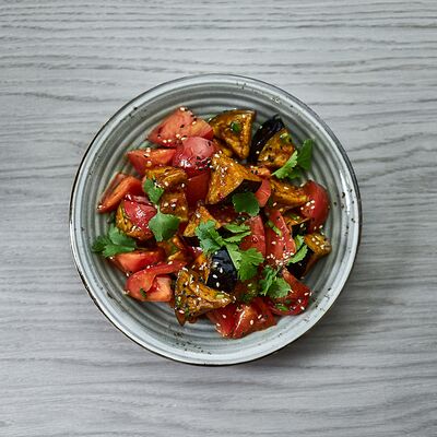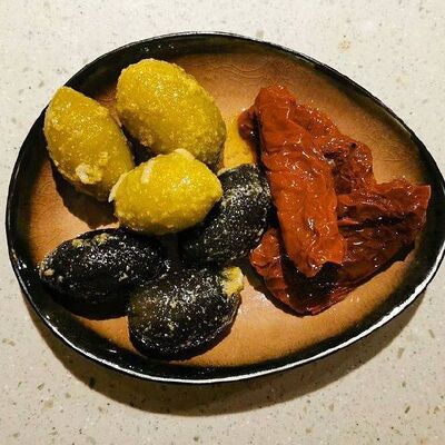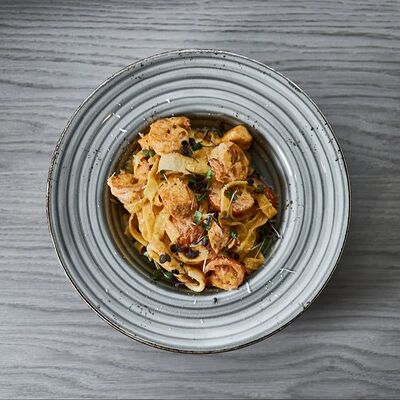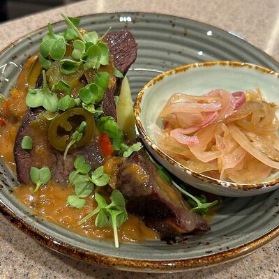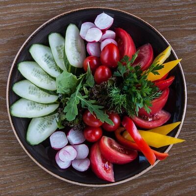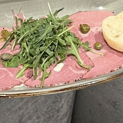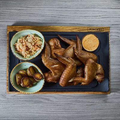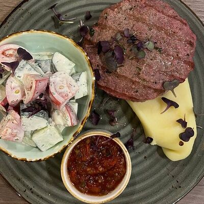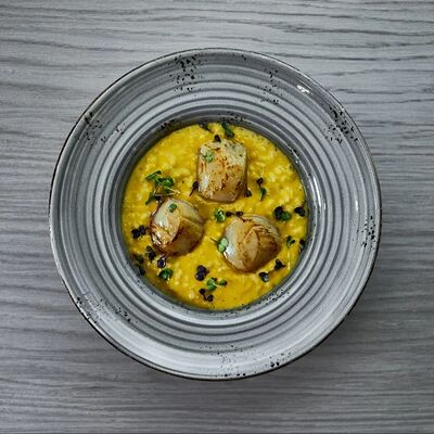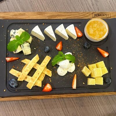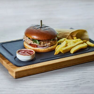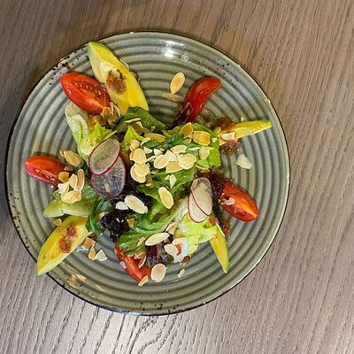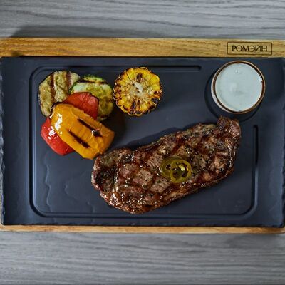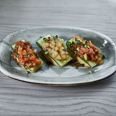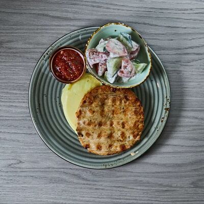 Средиземноморская дорадо, замаринованная с ароматными травами, молодым чесноком и лимоном, подается с микс салатом, долькой лимона, маринованным имбирем и маринадом Ромэйн