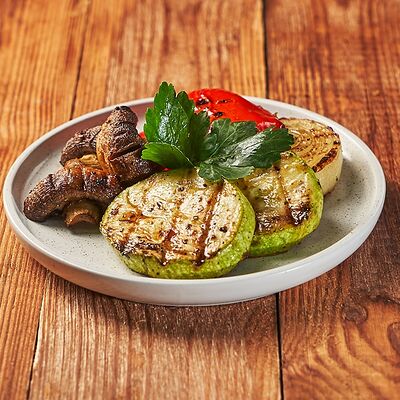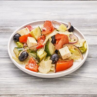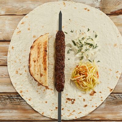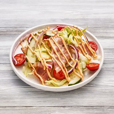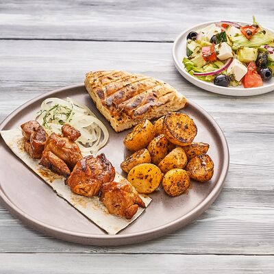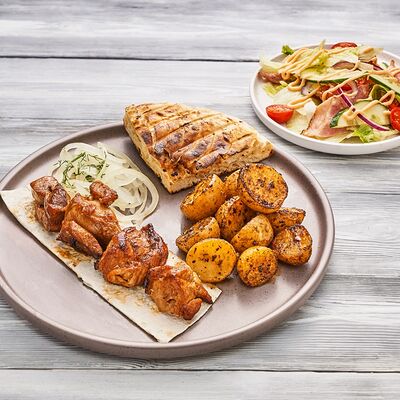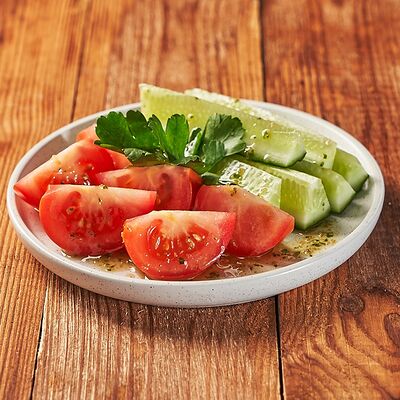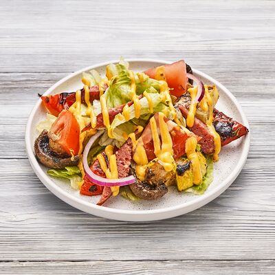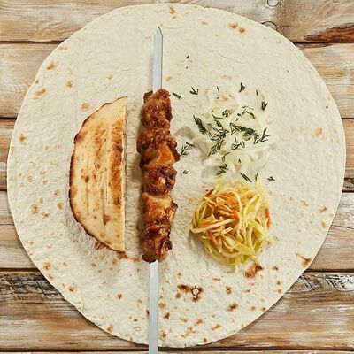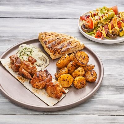 Огурцы, томаты, сыр, фирменный соус, шашлык на выбор