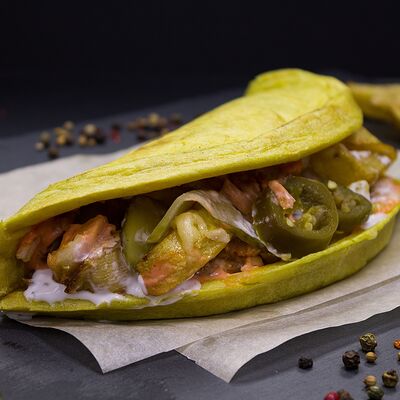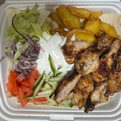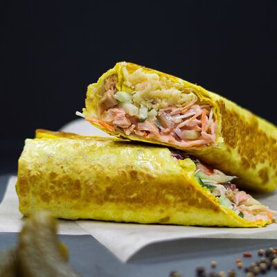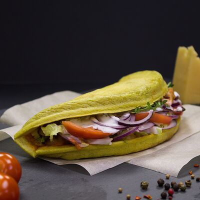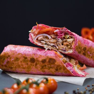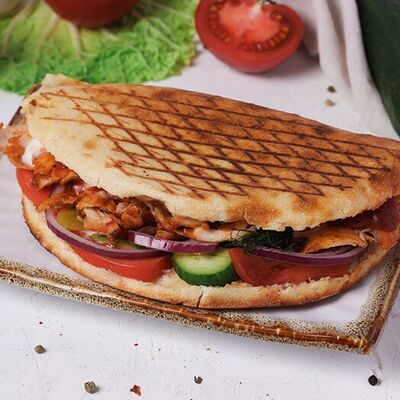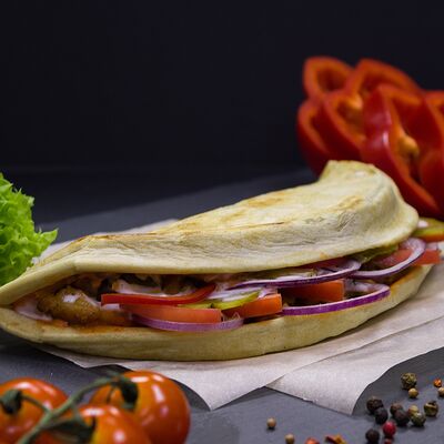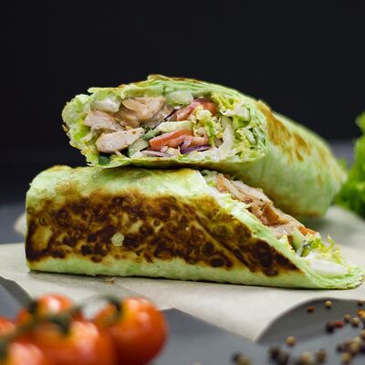 Курица (100 г), пшеничный корж, сыр, помидоры, огурцы, лук красный с зеленью, салат (айсберг, листья), соус чесночный