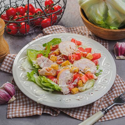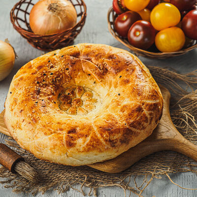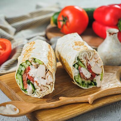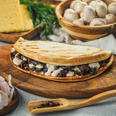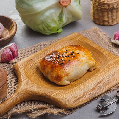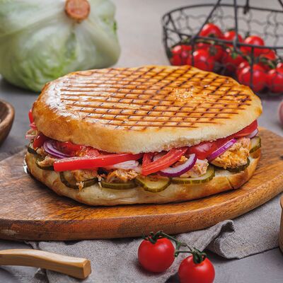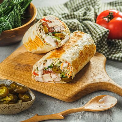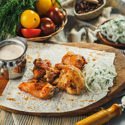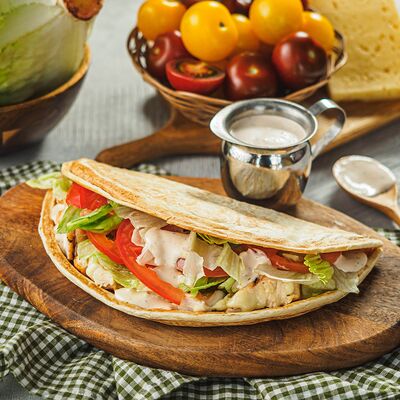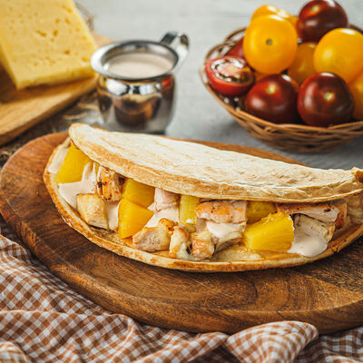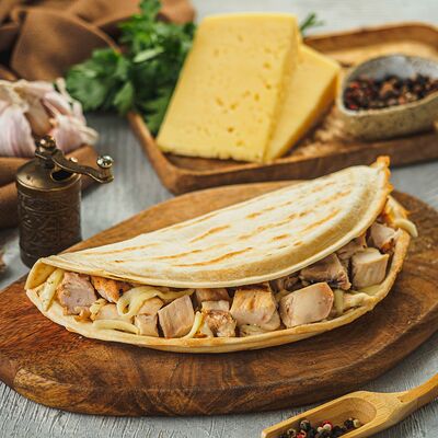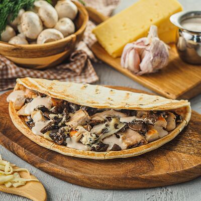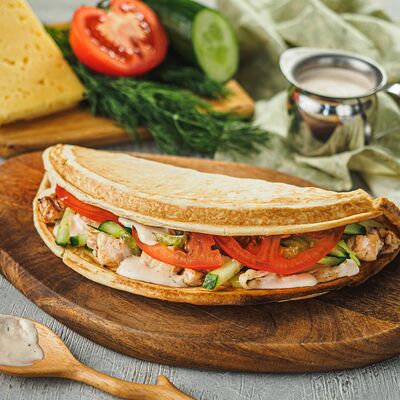 Курица на углях халяль, огурец, помидор, сыр, соус закрытая пицца (22 см)