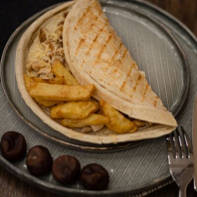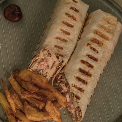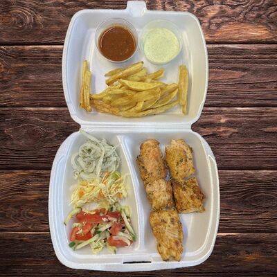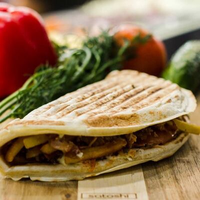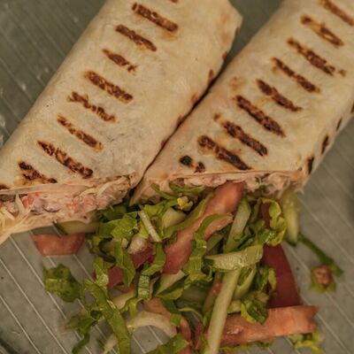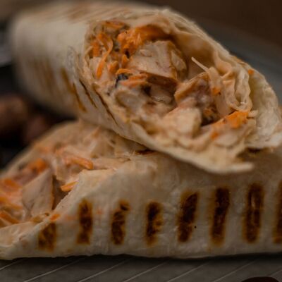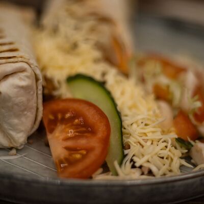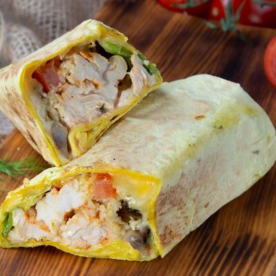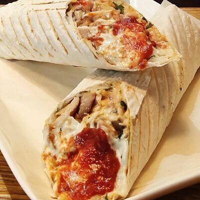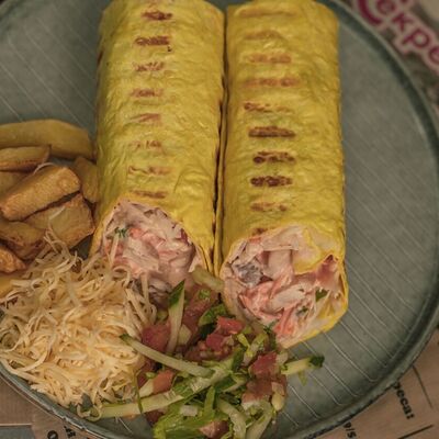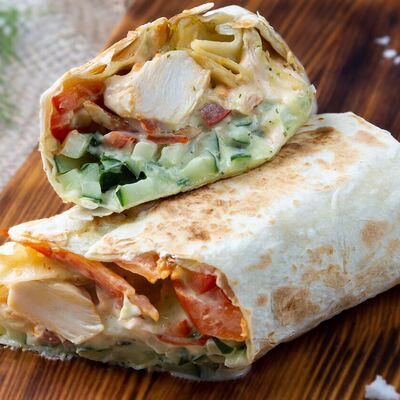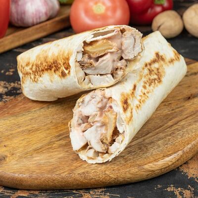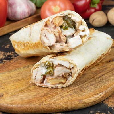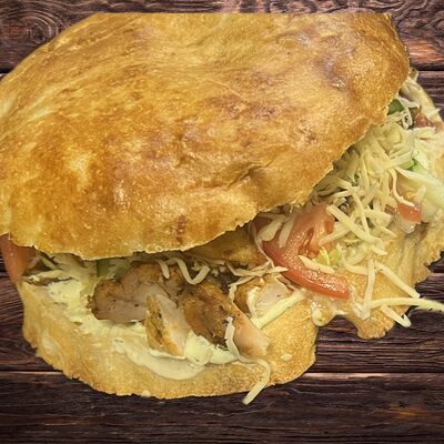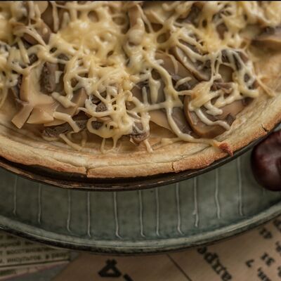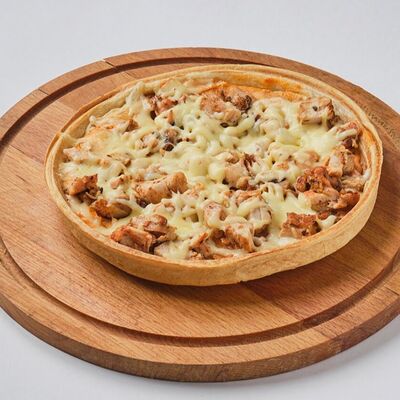 Курица, помидоры, огурцы, пекинский салат, сыр, фирменный соус, чесночный и томатный, основа для пиццы (22 см)