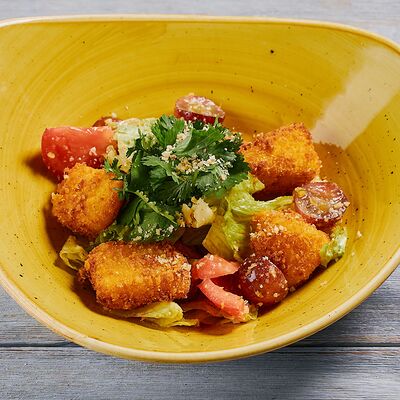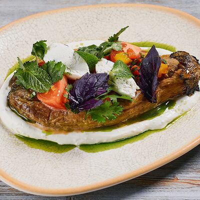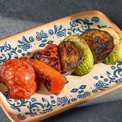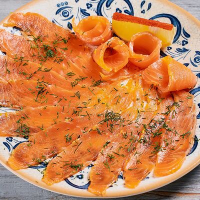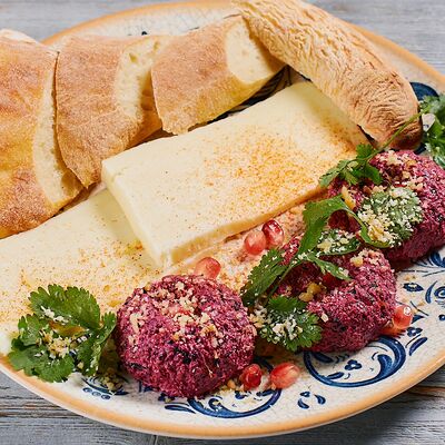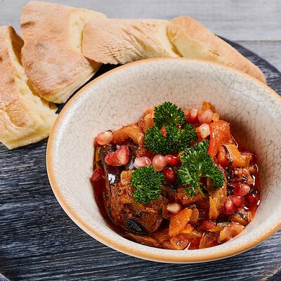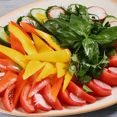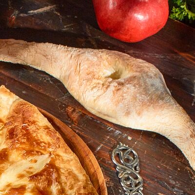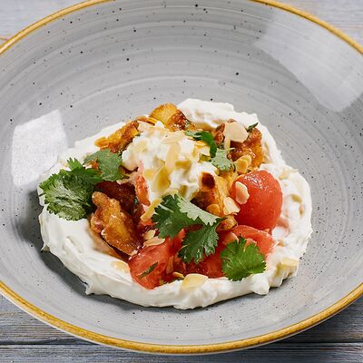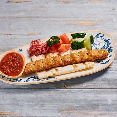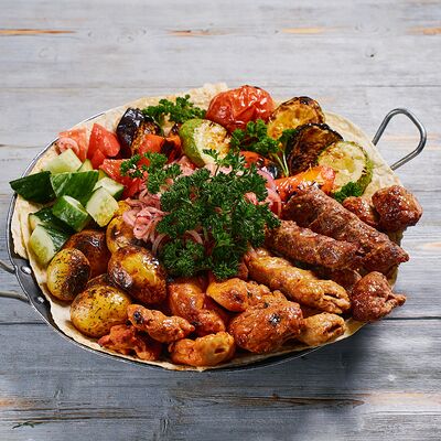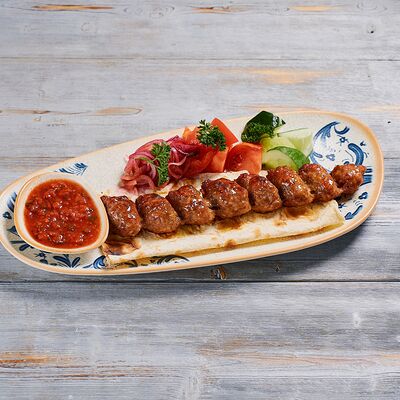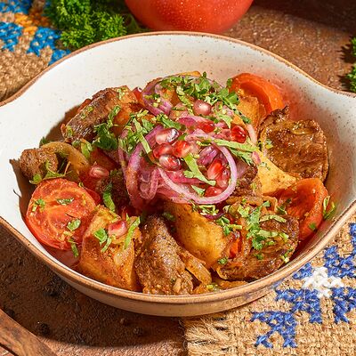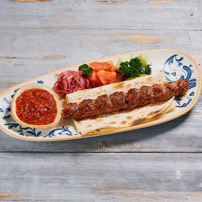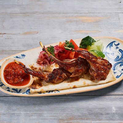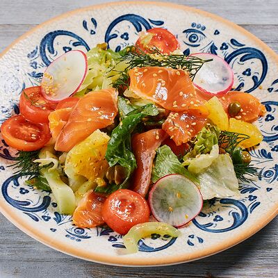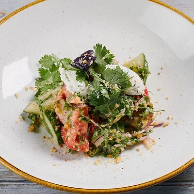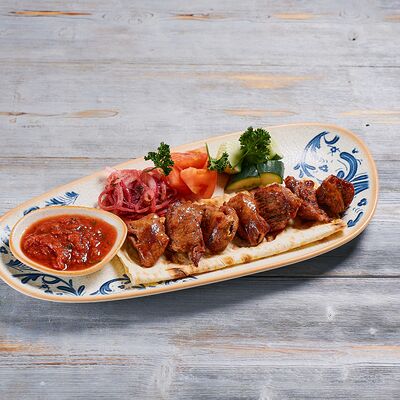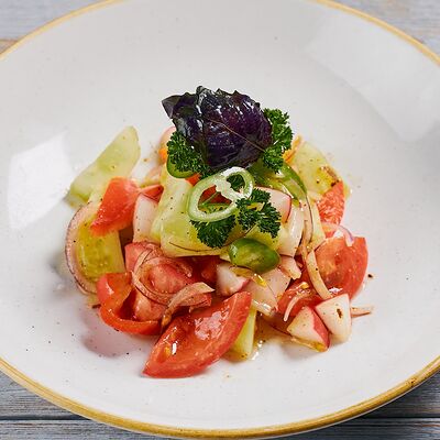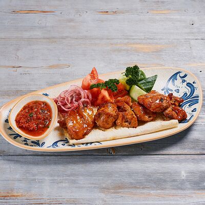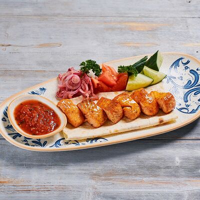 Морской лосось, огурец, помидор, маринованный лук (красный лук, масло нерафинированное, уксус, тимьян, укроп, соль сванская, сахар, кориандр, соль, барбарис, чеснок, Уцхо), соус наршараб, петрушка, лаваш, помидоры