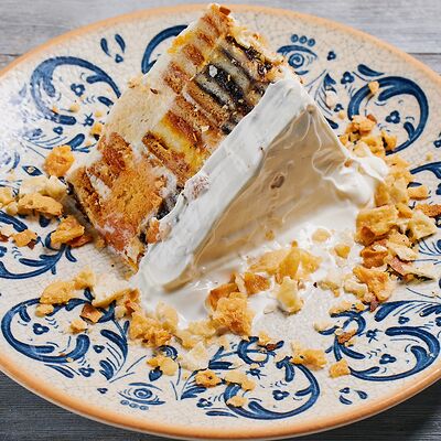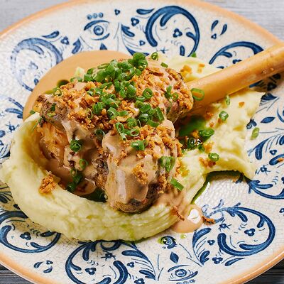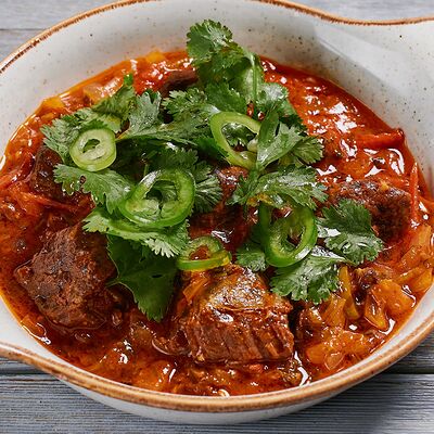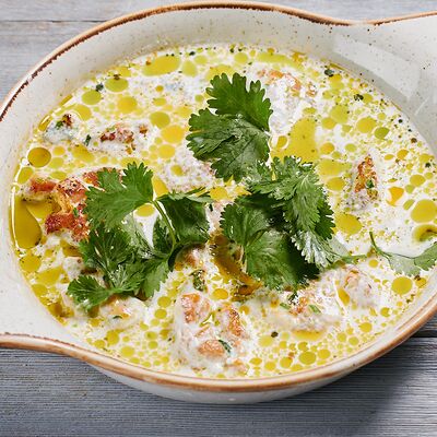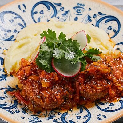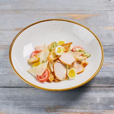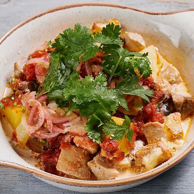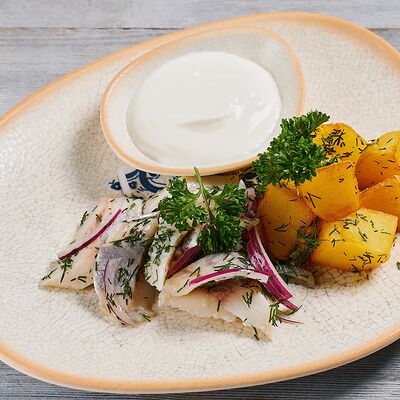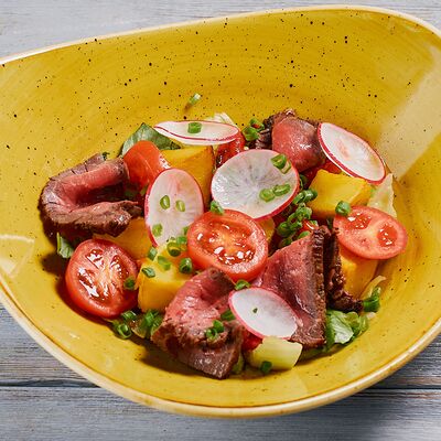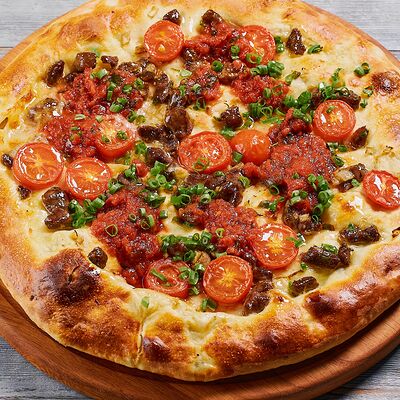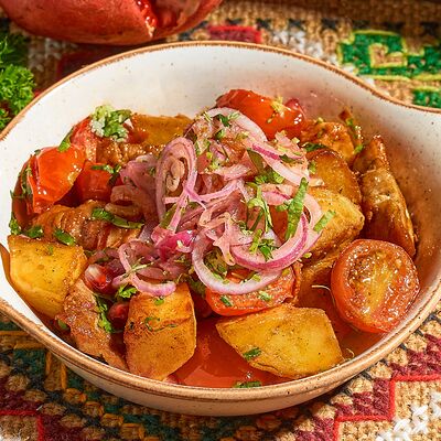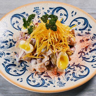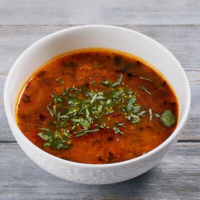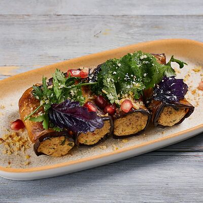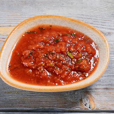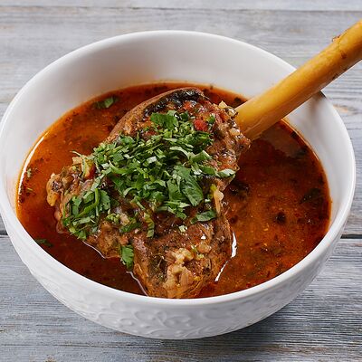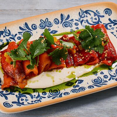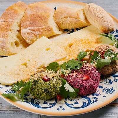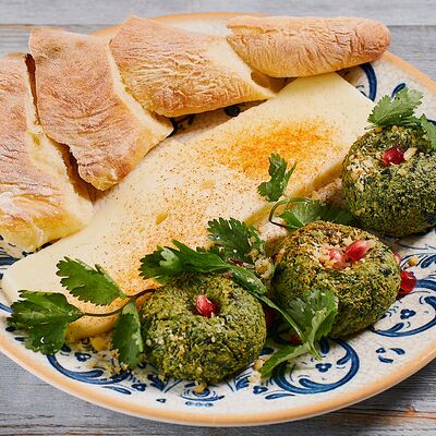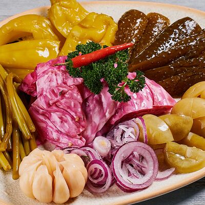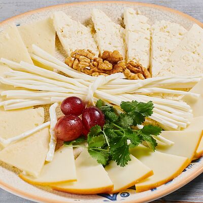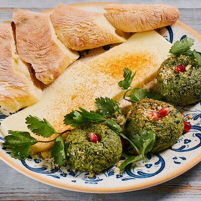 Морской лосось, огурец, помидор, маринованный лук (красный лук, масло нерафинированное, уксус, тимьян, укроп, соль сванская, сахар, кориандр, соль, барбарис, чеснок, Уцхо), соус наршараб, петрушка, лаваш, помидоры