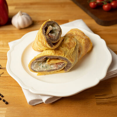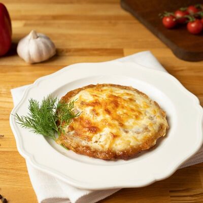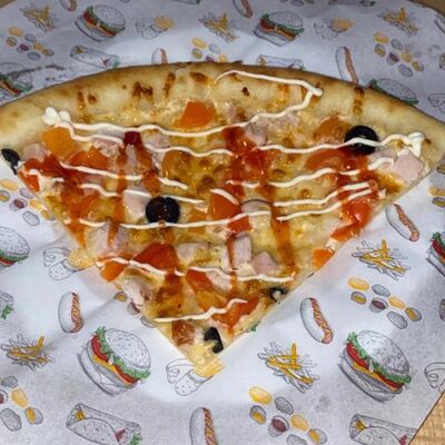 Нежное тесто, копченая курица, сладкий болгарский перец, сыр, маслины, фирменный соус (1/4 порции)
