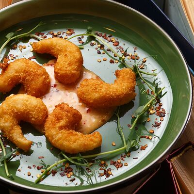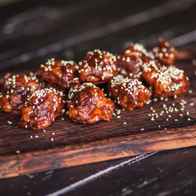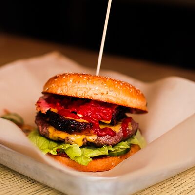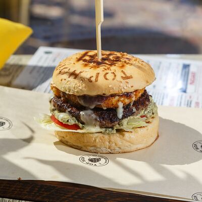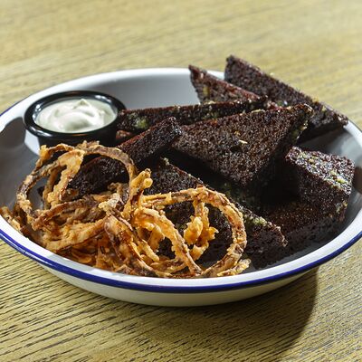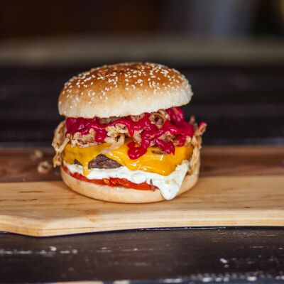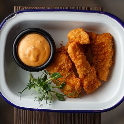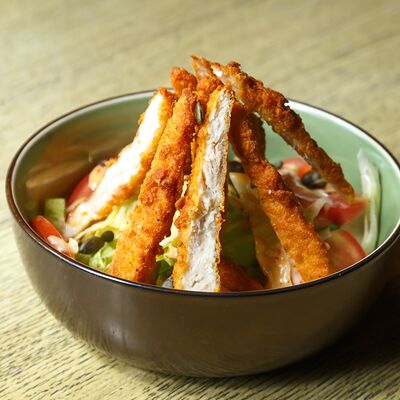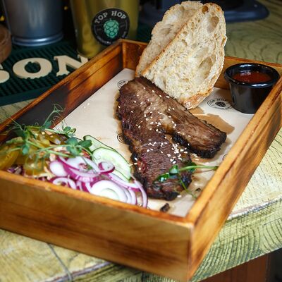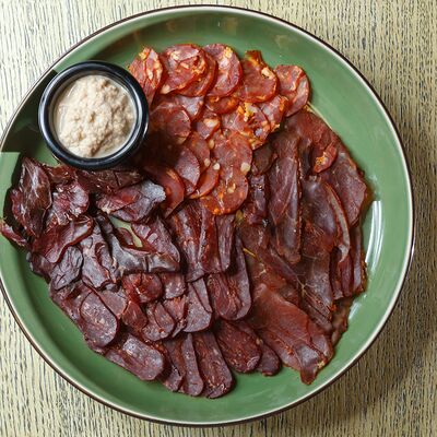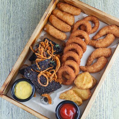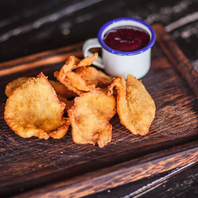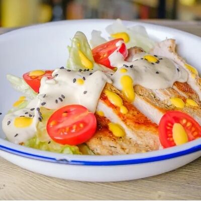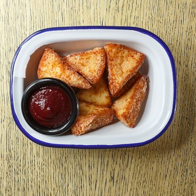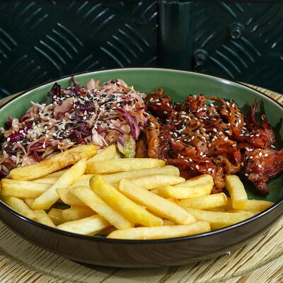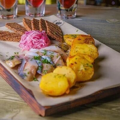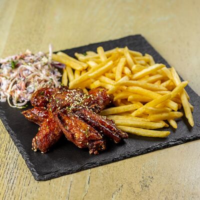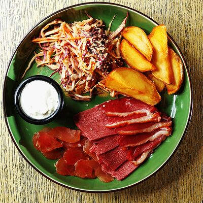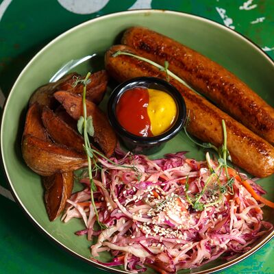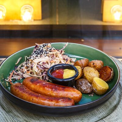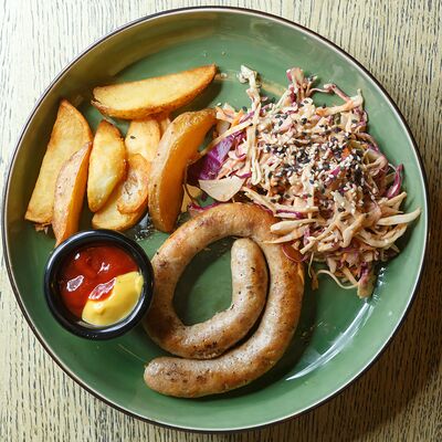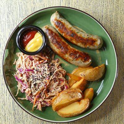 Колбаски из свинины, с сыром пармезан и шпинатом. С картофелем по-деревенски, Coleslaw из капусты и яблок, кетчупом и горчицей