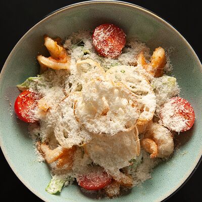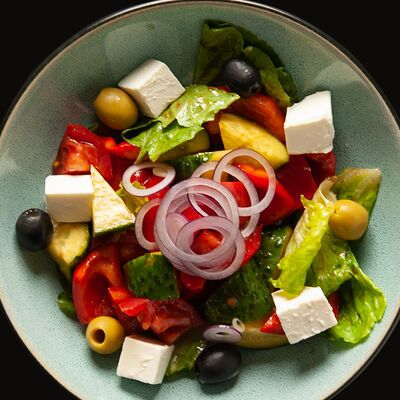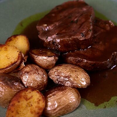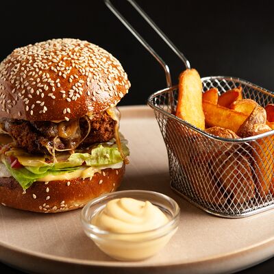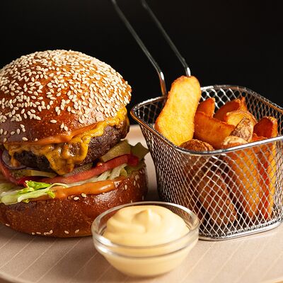 Котлета из мраморной говядины, сливочная булка с кунжутом, томат, маринованный огурец, красный лук, салат айсберг, соус барбекю, сыр чеддер, картофель по-деревенски с сырным соусом
