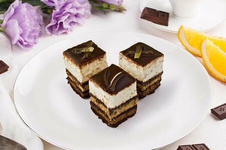 Пирожное Шоколадная симфония — мини-версия одноименного торта, созданное специально для тех, кто хочет попробовать и понять для себя вкус этого необычного десерта.В основе тончайший слой бисквита изготовленного из какао, без добавления муки, и три легких мусса: из насыщенного темного, нежного молочного и белого бельгийского шоколада. Сверху пирожные покрыты зеркальной шоколадной глазурью и украшены цукатами лимона.Пирожное Шоколадная симфония от Палыча это шесть нежнейших муссовых десертов, способных создать отличное настроение, и порадовать своим неповторимым вкусом.