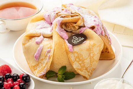 Нежнейший мусс из сметаны со взбитыми сливками и начинка из малины, красной и черной смородины. Этот десерт затейливо заворачивается в красивый блинный узелок. Мы декорировали его взбитыми сливками с ягодным сиропом и сахарной пудрой.