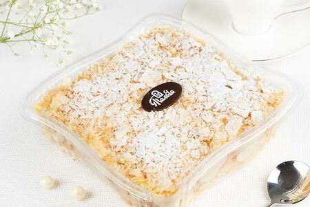 Мы замешиваем пышное слоеное тесто на муке хлебопекарной высшего сорта, добавляем крупные свежие куриные яйца и раскатываем вручную, чтобы не повредить слои. Готовим крем на настоящем пломбире, сливочном масле 82,5% и сметане собственного производства, а затем аккуратно выкладываем, чтобы тесто хорошо пропиталось и передало свой нежный сливочный вкус.