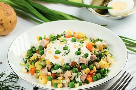 Классический рецепт любимого салата: отварной картофель, ветчина для завтрака «От Палыча» собственного производства из свинина, куриное яйцо и зеленый горошек, мягкая морковь, соленый огурец и легкий майонез в заправке.