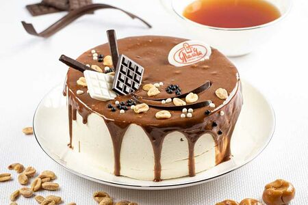 Торт декорирован шоколадной глазурью, украшен хрустящим соленым арахисом и шоколадными плитками. Яркое и необычное оформление этого десерта не оставит Вас равнодушными. Нежный сливочный крем в тандеме со сладкой карамелью, соленым арахисом и шоколадным бисквитом очарует не только взрослых, но и маленьких сладкоежек.