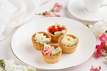 Пирожное Корзиночка изготовлено из рассыпчатого песочного теста с наполнителем из джема «Малина с яблоком», и сверху декорировано нежным кремом на основе сливочного масла и сгущенного молока. Эти мини-десерты безусловно понравятся детям за их компактность, красивый яркий вид и неповторимый вкус.