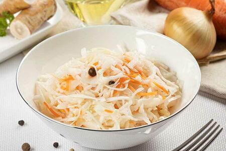 Закуска к любому столу: хрустящая капуста, маринованная с острым хреном и кусочками свежей моркови. В маринаде — пряный перец и душистый лавровый лист.