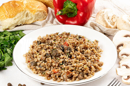Отварная гречка с обжаренными шампиньонами и болгарским перцем.