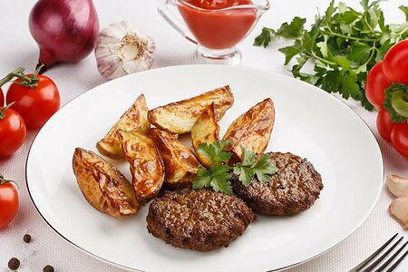 Оладьи из отборной говяжьей печени с добавлением моркови и лука. Ароматные картофельные дольки с пряными специями и чесноком на гарнир.