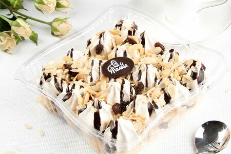 Мы выпекаем безе по особой технологии. Его вкус получается невероятно карамельным воздушным и нежным. Завариваем цитрусовый курд с натуральным соком лимона и апельсина. Готовим заварной крем на пломбире и сливочном масле 82,5% и добавляем изюм сорта Малаяр, который предварительно настаиваем на коньяке, чтобы он передал торту свою объемную ароматику.