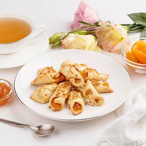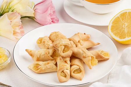 Сочный лимон в сахаре в нежном дрожжевом конвертике, приготовленном из пшеничной муки на натуральном молоке. Конвертики украшены лепестками арахиса.