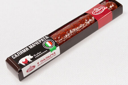 Сырокопченая колбаса Салями Мачерата обладает плотным дымным ароматом копченого мяса. В составе — отборное куриное филе без прожилок, вкрапления сочного шпика и ароматные специи.