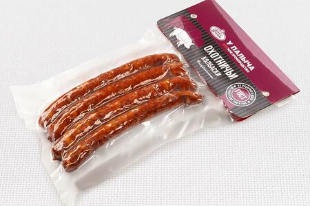 Подкопченные колбаски из говядины и свинины с добавлением крупного шпика, с ароматом чеснока и специй в натуральной оболочке. Рецептура ГОСТ.