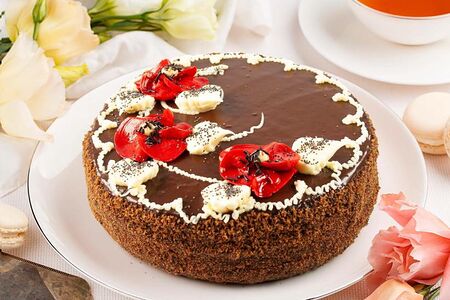 Оформление заслуживает отдельного внимания. Сверху торт полит шоколадной глазурью, декорирован кремовыми узорами и ярко-красными цветами мака. По краям посыпка из шоколадного бисквита.