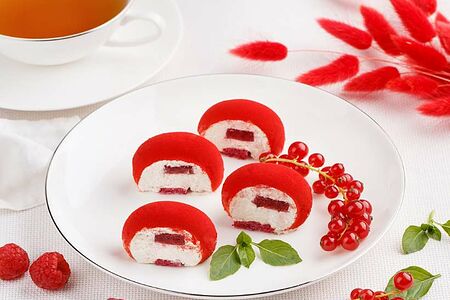 Пирожное Малина и Базилик — весьма необычный десерт, с прекрасно сочетающейся оригинальной комбинацией вкусов. Из названия уже понятно, что основные это малина и базилик.Яркий малиновый бисквит, пропитанный сладким сиропом, желе из ягод малины и муссовый легкий крем с добавлением зеленого базилика — это просто умопомрачительное сочетание. Сочное и легкое пирожное, с идеально сбалансированным вкусом и притягивающим внимание ярко-красным оформлением.Пирожное Малина и Базилик от Палыча нежное и вкусное лакомство, с интересным сочетанием вкусов, которое обязательно стоит попробовать!