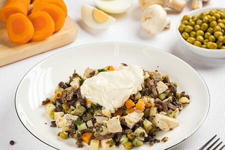 Отваренная куриная грудка, обжаренные шампиньоны, свежие и консервированные огурцы, картофель с морковкой и зеленым горошком.