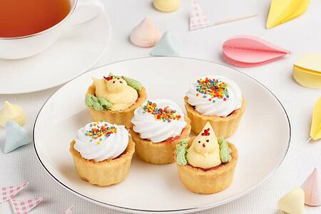 Корзиночка Весёлые цыплята это мини-десерт, который может дополнить детское меню, либо может выступать как самостоятельное угощение, как для детей, так и взрослых.Рассыпчатые песочные корзиночки изготовлены из пшеничной муки высшего сорта с конфитюром из сочной малины с легким белковым кремом из натуральных яиц. Корзиночки буквально тают во рту. Яркое, необычное оформление в виде фигур цыплят обязательно приведут в восторг любого ребенка.Корзиночка Весёлые цыплята от Палыча — отличное решение для детского праздника, которое точно не оставит равнодушным маленьких сластён.