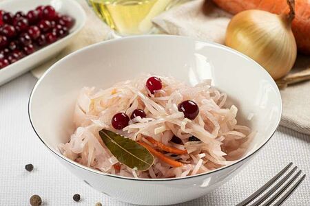 Закуска к любому столу: хрустящая капуста, маринованная с кусочками свежей моркови и ягодами сочной клюквы, что придает блюду яркий вкус. В маринаде — острый чеснок, пряный перец и душистый лавровый лист.