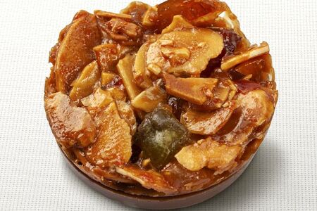 Миндальные лепестки, цукаты и вишня, пропитанные медом, уложены на медаль из молочного 39%-го шоколада «Superalpina».